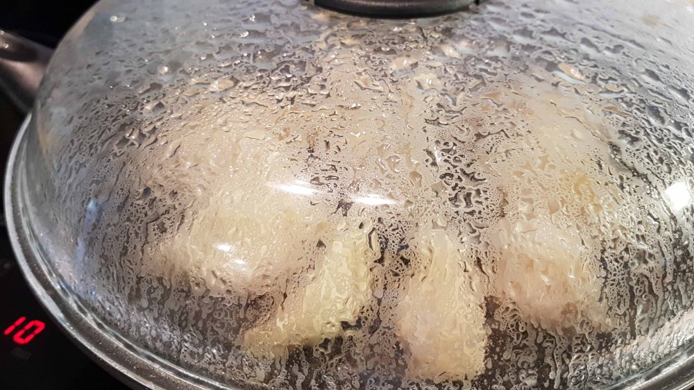Zum Dämpfen geben wir ein wenig heißes Wasser dazu und schließen sofort den Deckel. Der Dämpfvorgang dauert 8-10 Minuten.