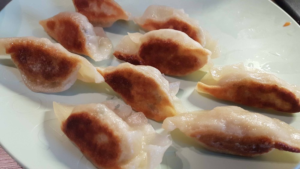 Die Gyozas werden in der Pfanne kreisförmig angeordnet und bei mittlerer Hitze gebraten.