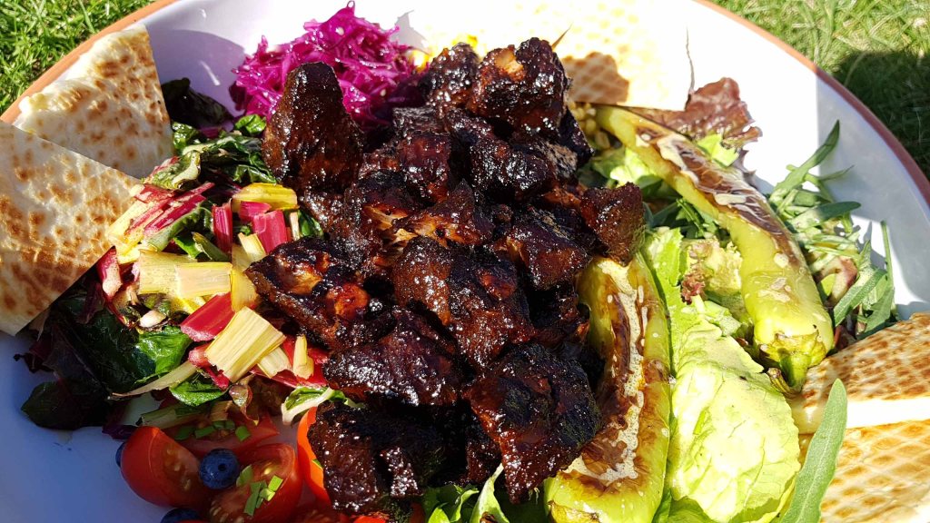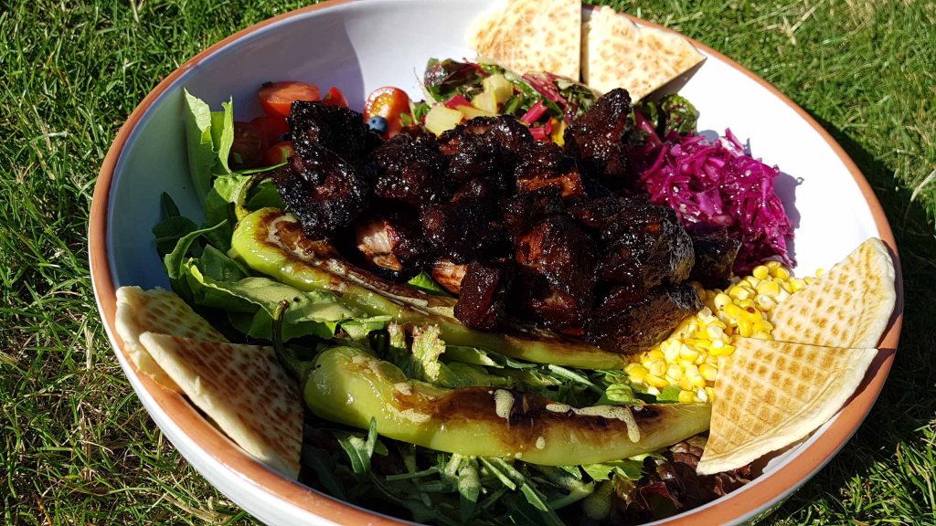 Der rote Krautsalat ist klassisch angemacht mit Essig und Öl. Für den grünen Salat habe ich ein Senf-Essig-Öl Dressing vorbereitet. Und dann kam zusammen, was zusammen kommen musste. Alle Einzelkomponenten hübsch in einer großen Schüssel (neudeutsch: Bowl) nebeneinander anrichten, Dressing verteilen, Tomaten vierteln, Mangold etc….. und zum Schluß die Burnt Ends nochmal in der Pfanne mit etwas zusätzlicher BBQ Soße erwärmt…..und noch die übrig gebliebenen Fladenbrote kurz im Toaster warm gemacht.
