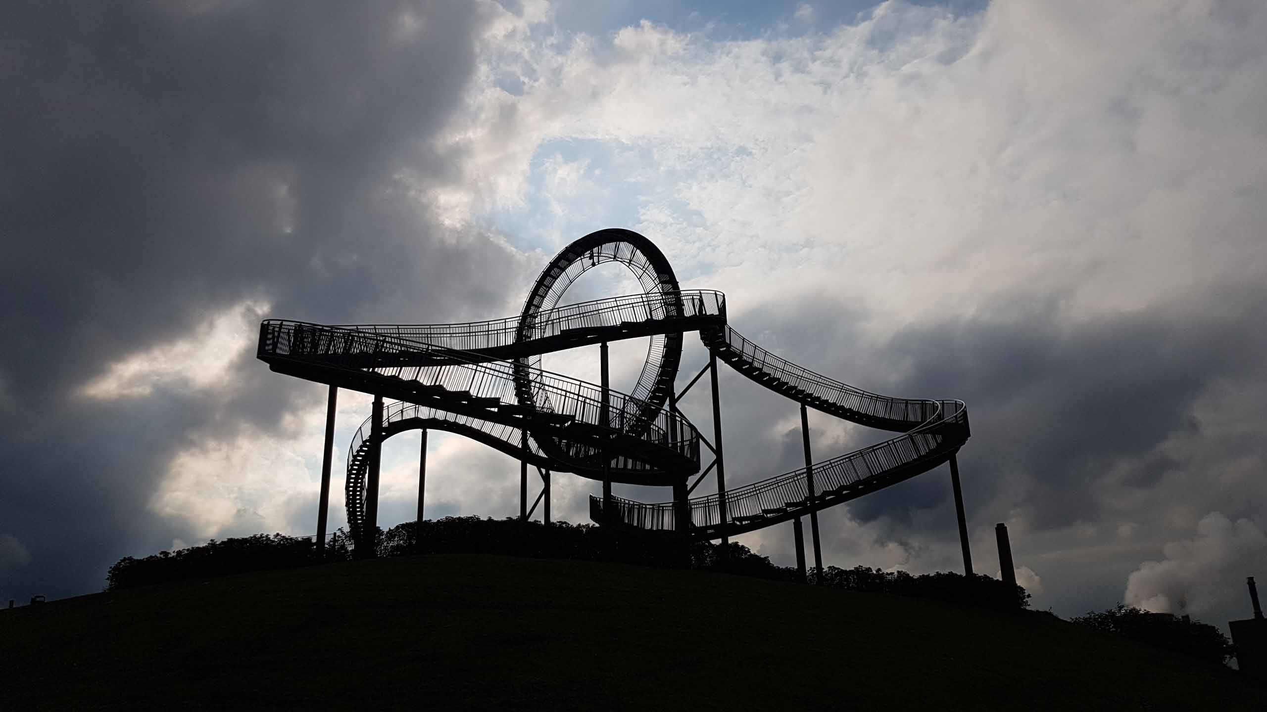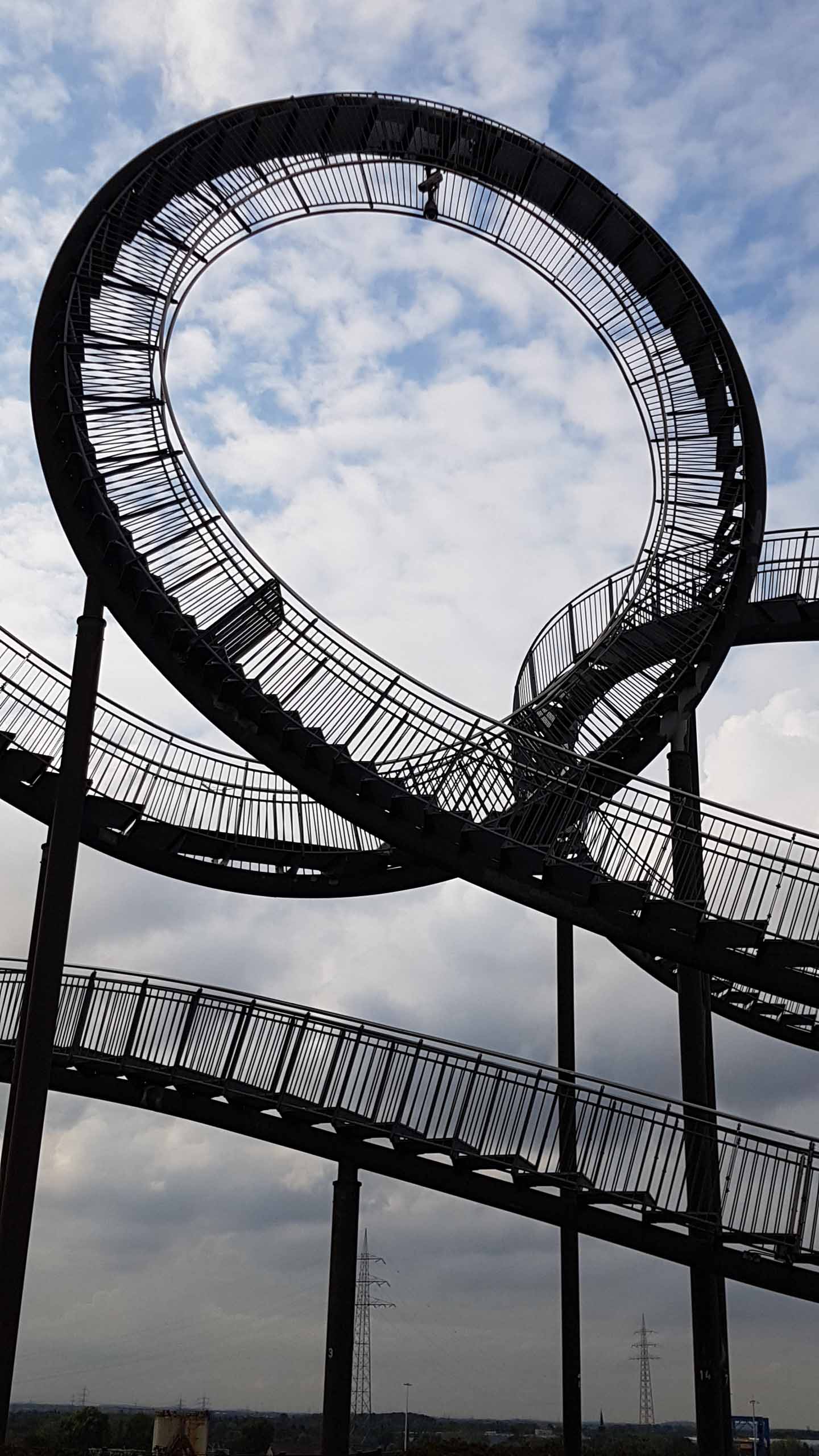Für uns ging’s wieder zurück Richtung Duisburg Süd. Dort steht auf einer Anhöhe (Landmarke) das Kunstobjekt Tiger & Turtle – Magic Mountain. Es sieht aus wie eine Achterbahn und ist normalerweise begehbar. Leider war auch hier geschlossen, der Blick war trotzdem grandios und das Gebilde sowieso der Hammer.