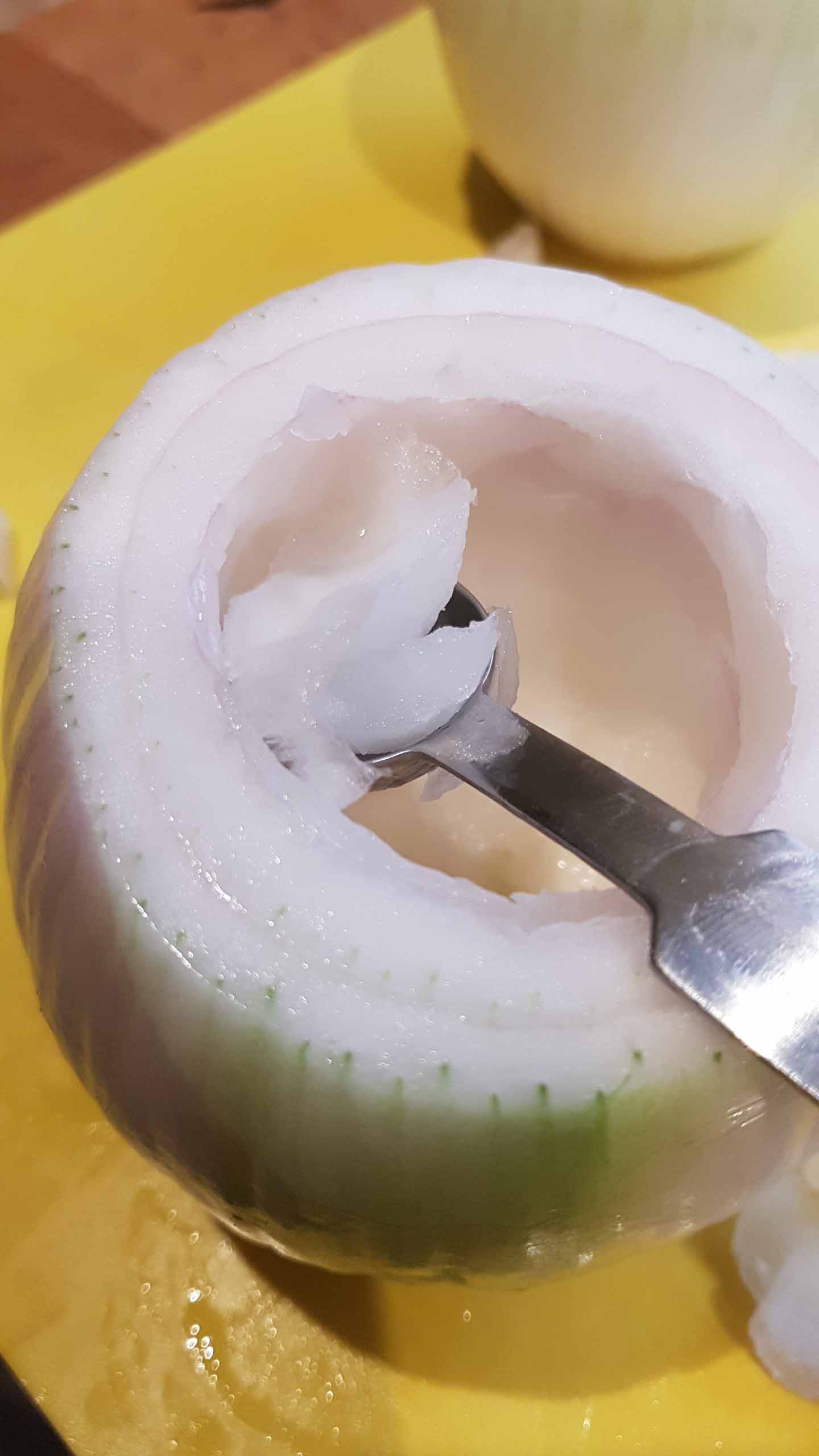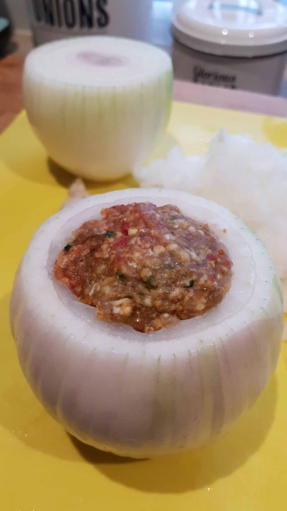 Dann oben eine Kappe abschneiden und die Zwiebel aushöhlen. Ich habe 2 „Ringe“ stehen lassen, dann hat die Zwiebel noch genügend Stabilität zum Einfüllen des Hackfleisches oder des Gemüses.