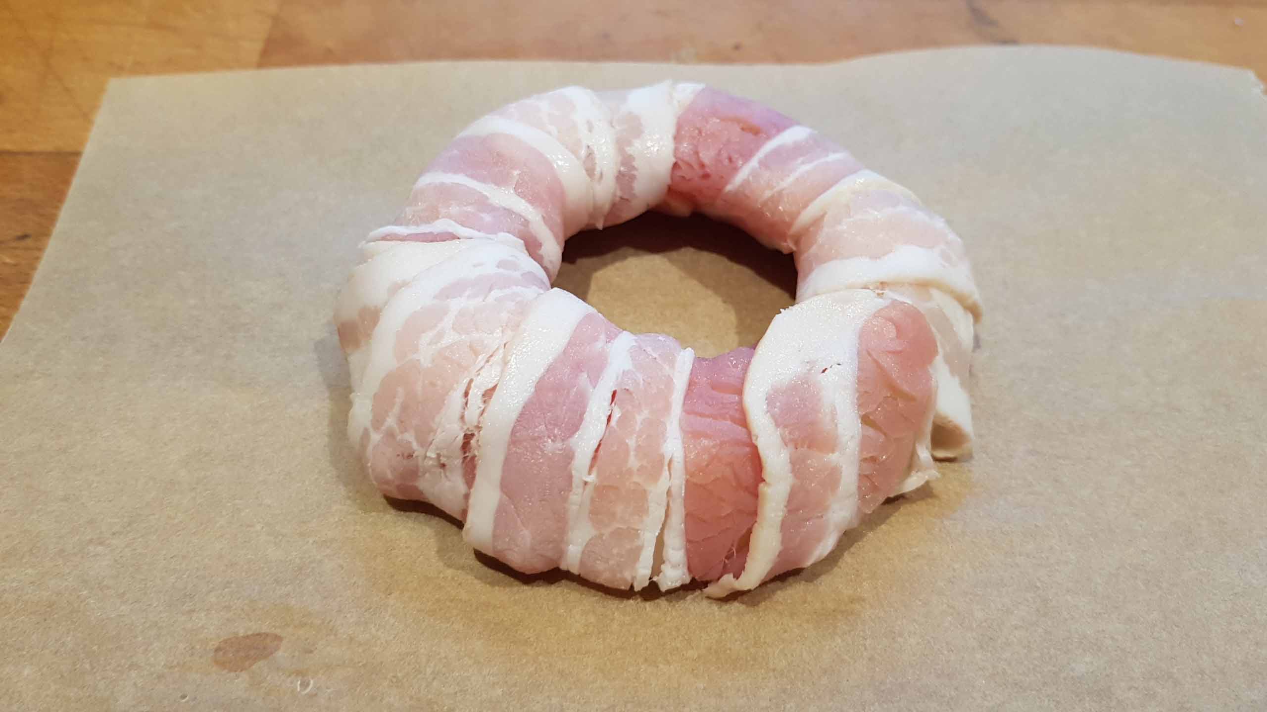 Dann fängst du an, den Bacon drum zu wickeln und bepinselst die Loops mit BBQ Soße.