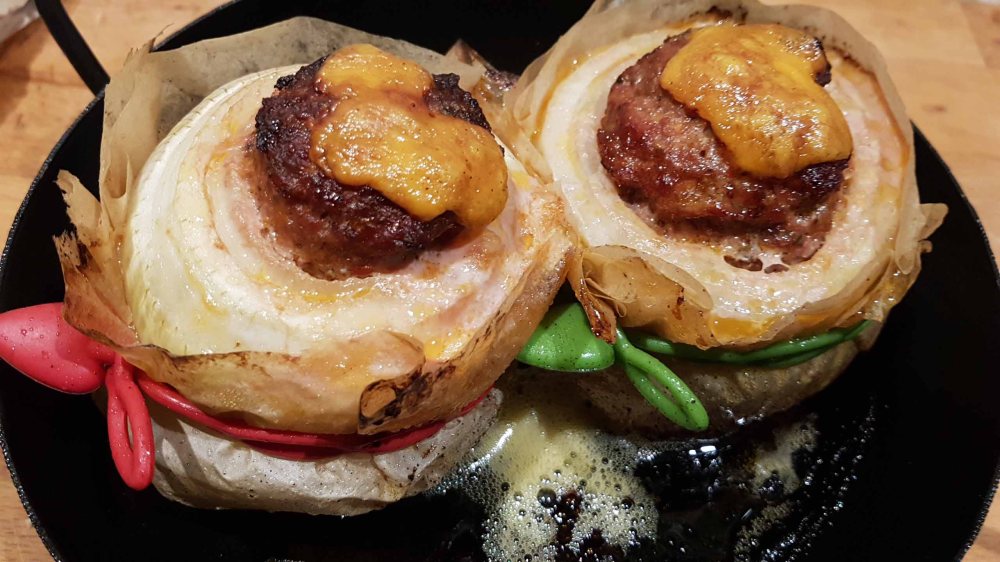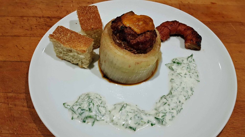 Dazu hatten wir, weil es eben genug Zwiebeln gab, noch Zwiebel-Bacon-Loops, bepinselt mit BBQ Soße.