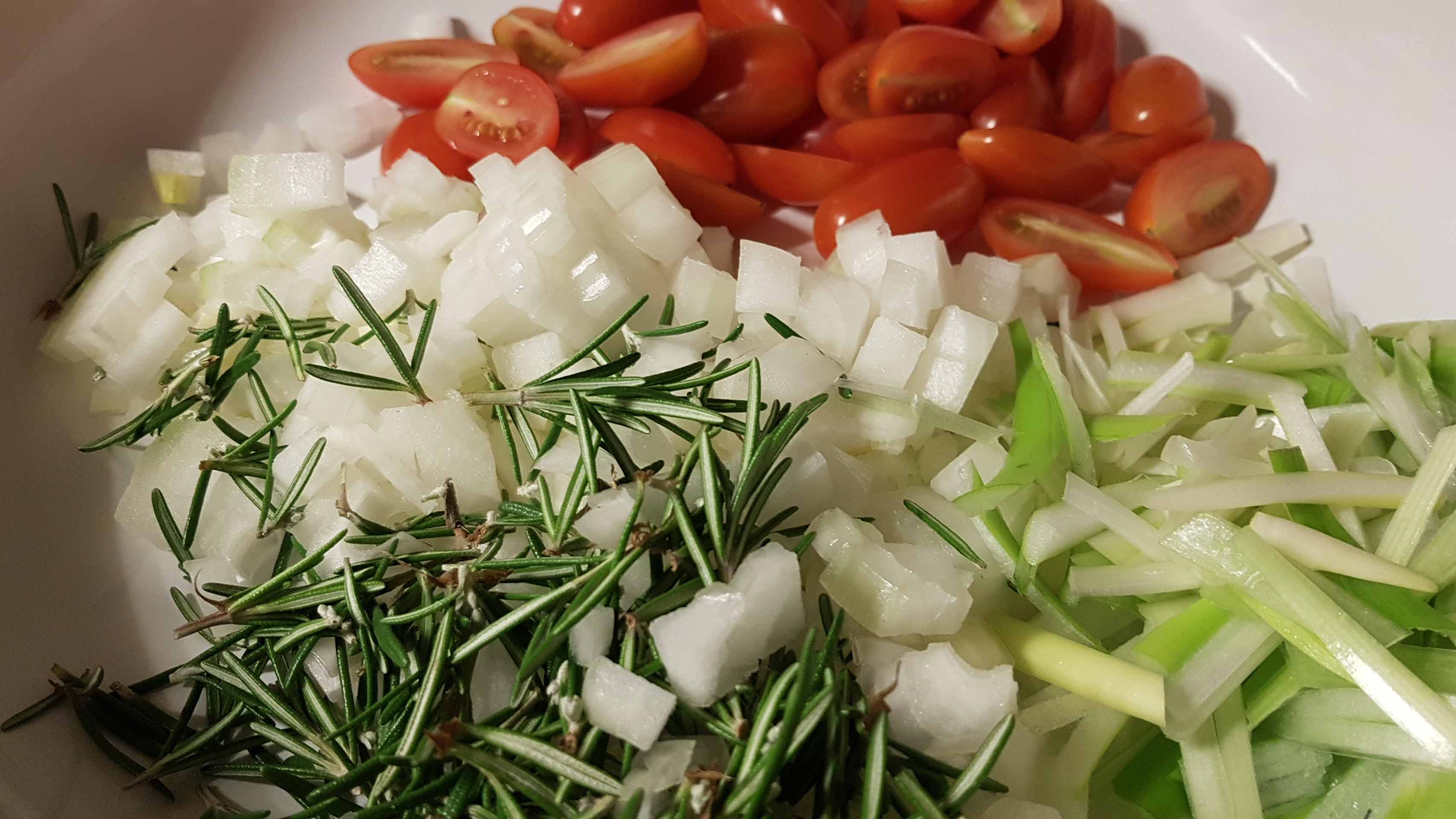 Für den Sud klein geschnittene Zwiebeln in Butterschmalz andünsten. Einen großen Zweig Rosmarin zerpflücken und mitdünsten lassen. Jetzt kommen noch halbierte Datteltomaten und fein geschnittene Frühlingszwiebel rein und alles wird etwa 5min angedünstet.