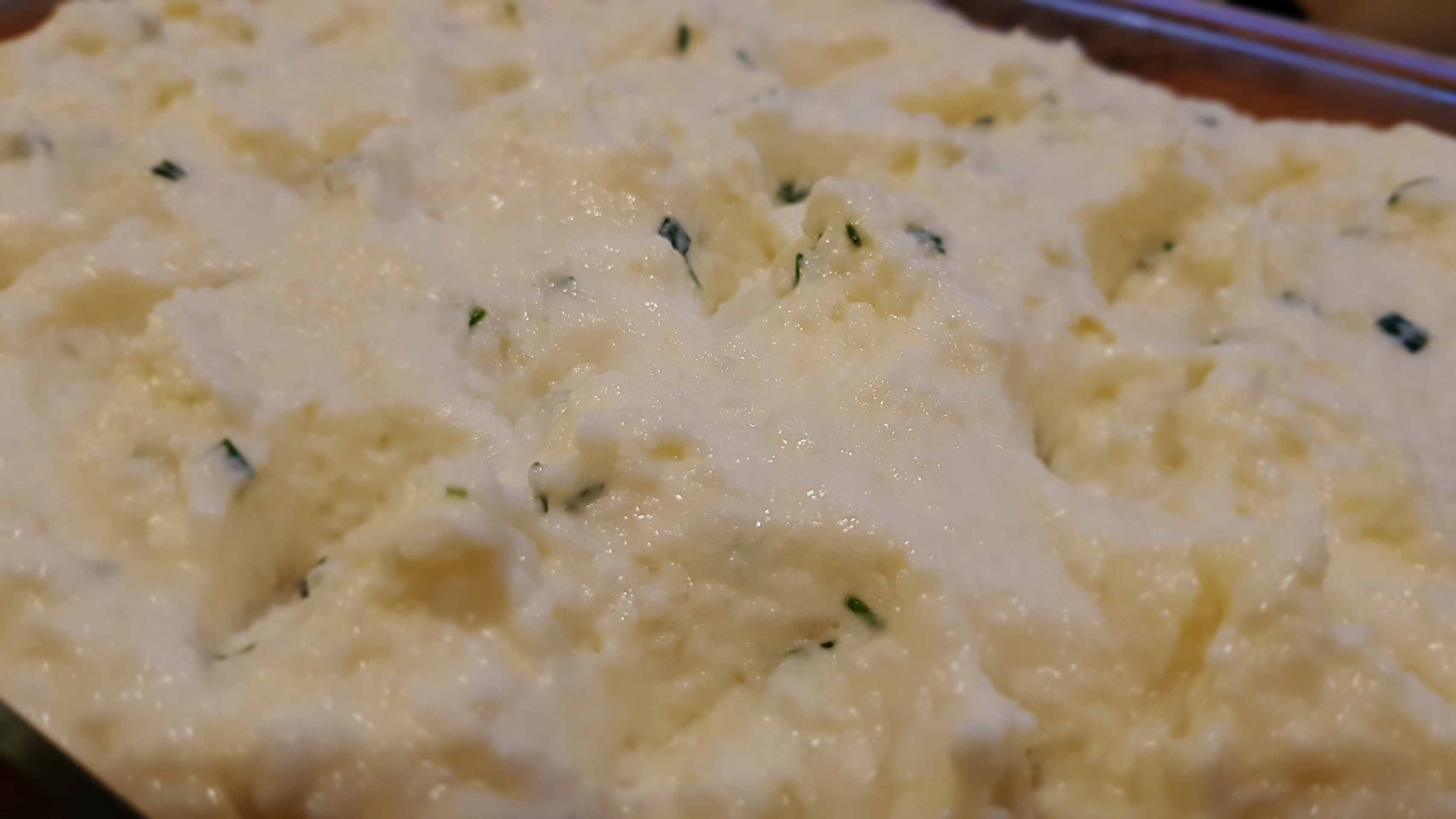 Dann den Frischkäse, den Cheddar und die Kräuter mit dem Blumenkohlstampf verrühren, mit Salz und Pfeffer würzen.