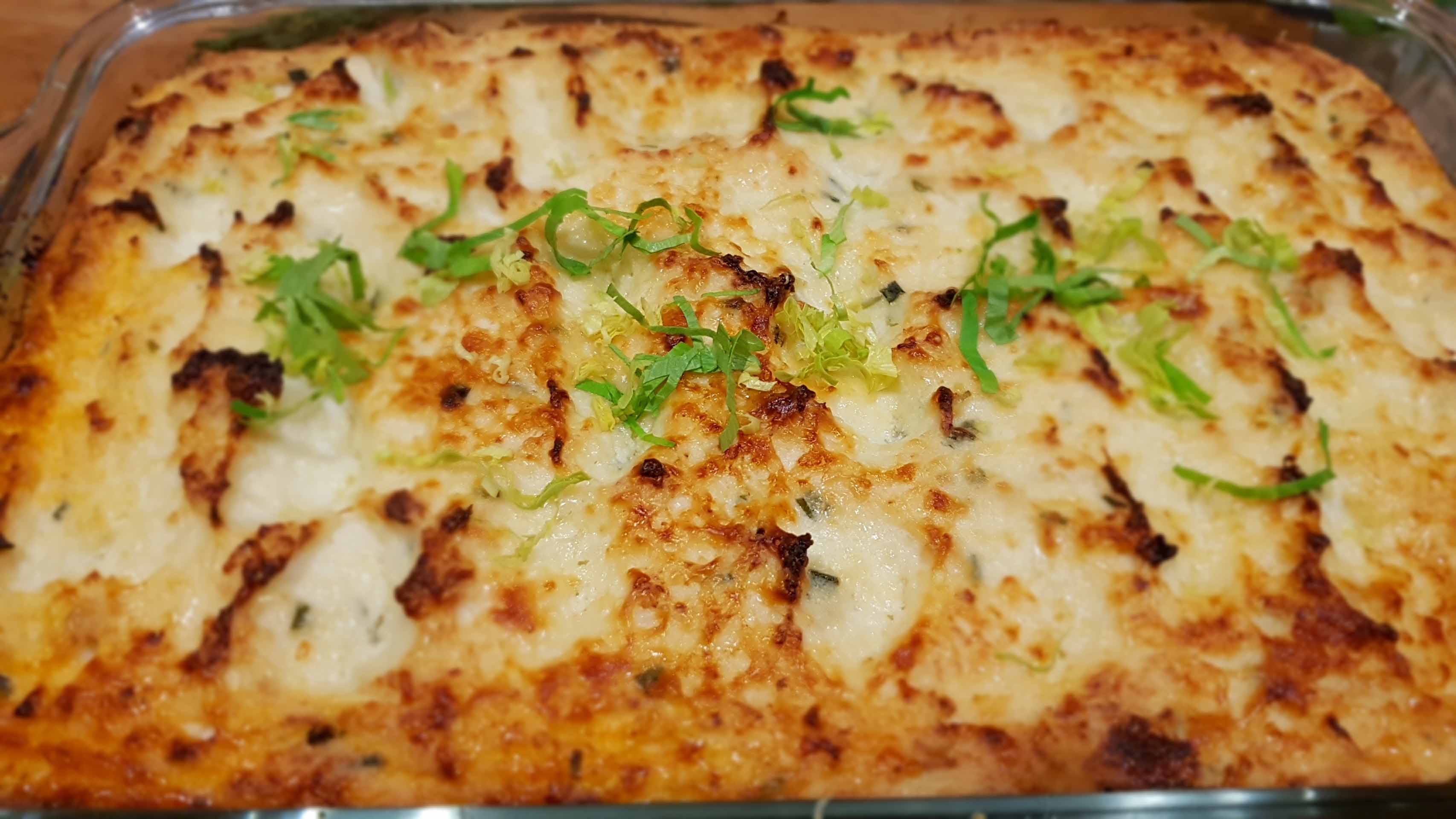 Die Basis in eine Auflaufform füllen, glatt streichen und anschließend die Blumenkohlmasse darauf verteilen. Die Oberfläche, so hab ich´s bei Jamie Oliver gelernt, nicht glatt streichen sondern mit dem Löffel kleine Dellen eindrücken. So entsteht eine Kraterlandschaft, die , wenn man nochmal etwas Käse drauf gibt, wunderbare knusprige Berge schafft…..ja geil! Ja, nochmal Cheddar drüber reiben ist ein MUSS!