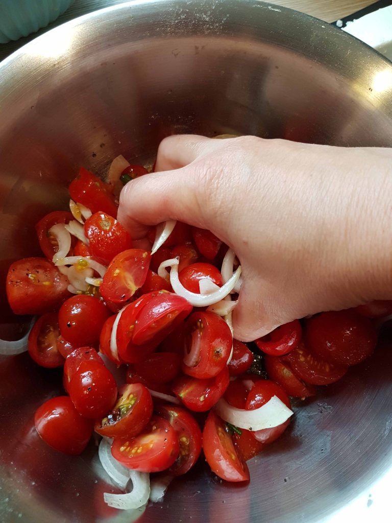 Wir haben dazu einen würzigen Tomatensalat mit viel Schnittlauch, Zwiebeln und zerkrümeltem Manouri gegessen. Zubereitet nur mit Essig und Olivenöl, Salz und Pfeffer. Die Tomaten wurden ganz rustikal mit der Hand zerdrückt und der Salat schön lange durchziehen lassen.