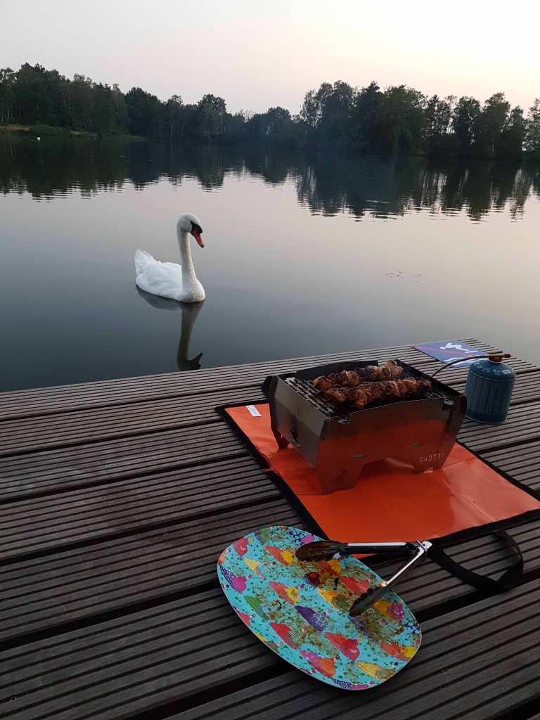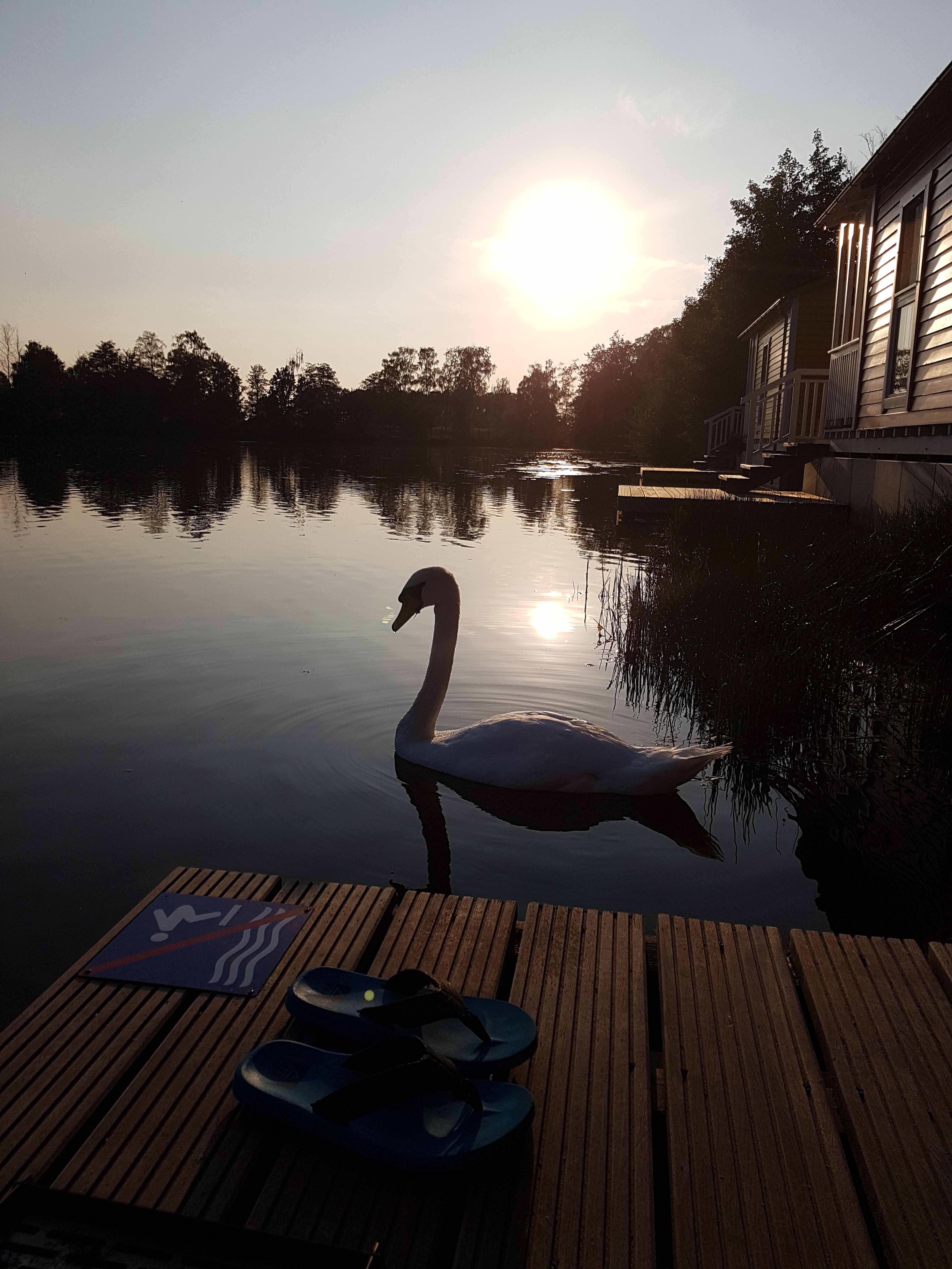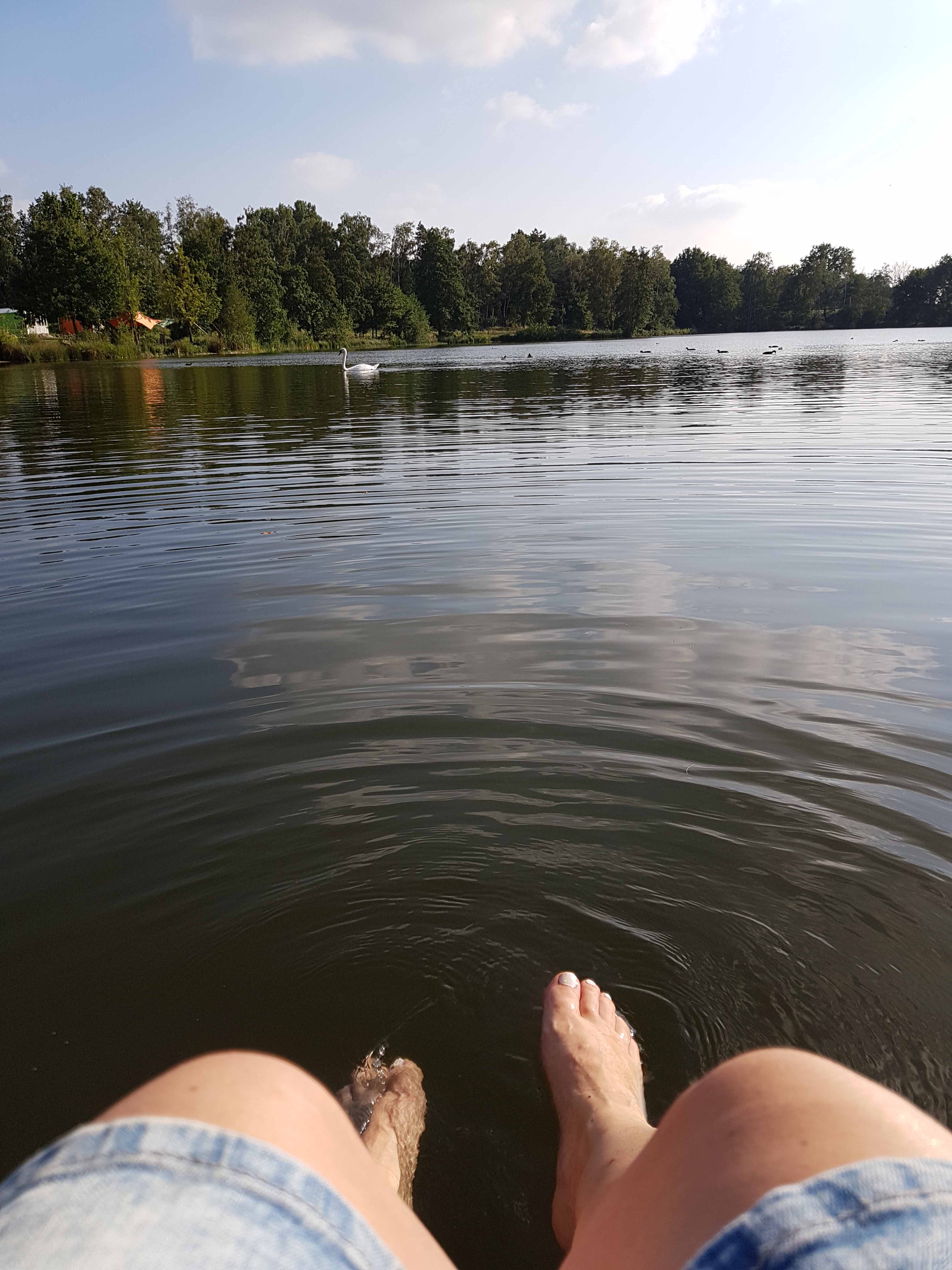 Die Holzterrasse haben wir gut genutzt, denn das Wetter war echt klasse und sonnig, so dass wir in Gesellschaft von einem anhänglichen Schwan lange sitzen konnten, die Füße im Wasser baumelnd, ein Bier / Wein in der Hand.