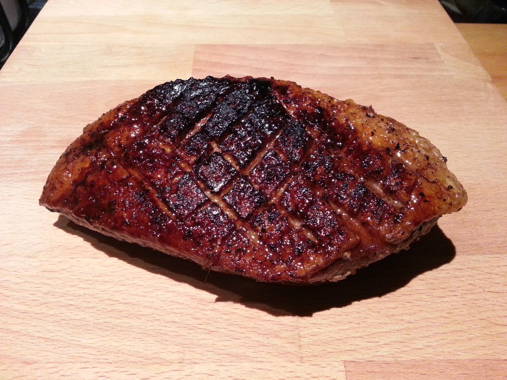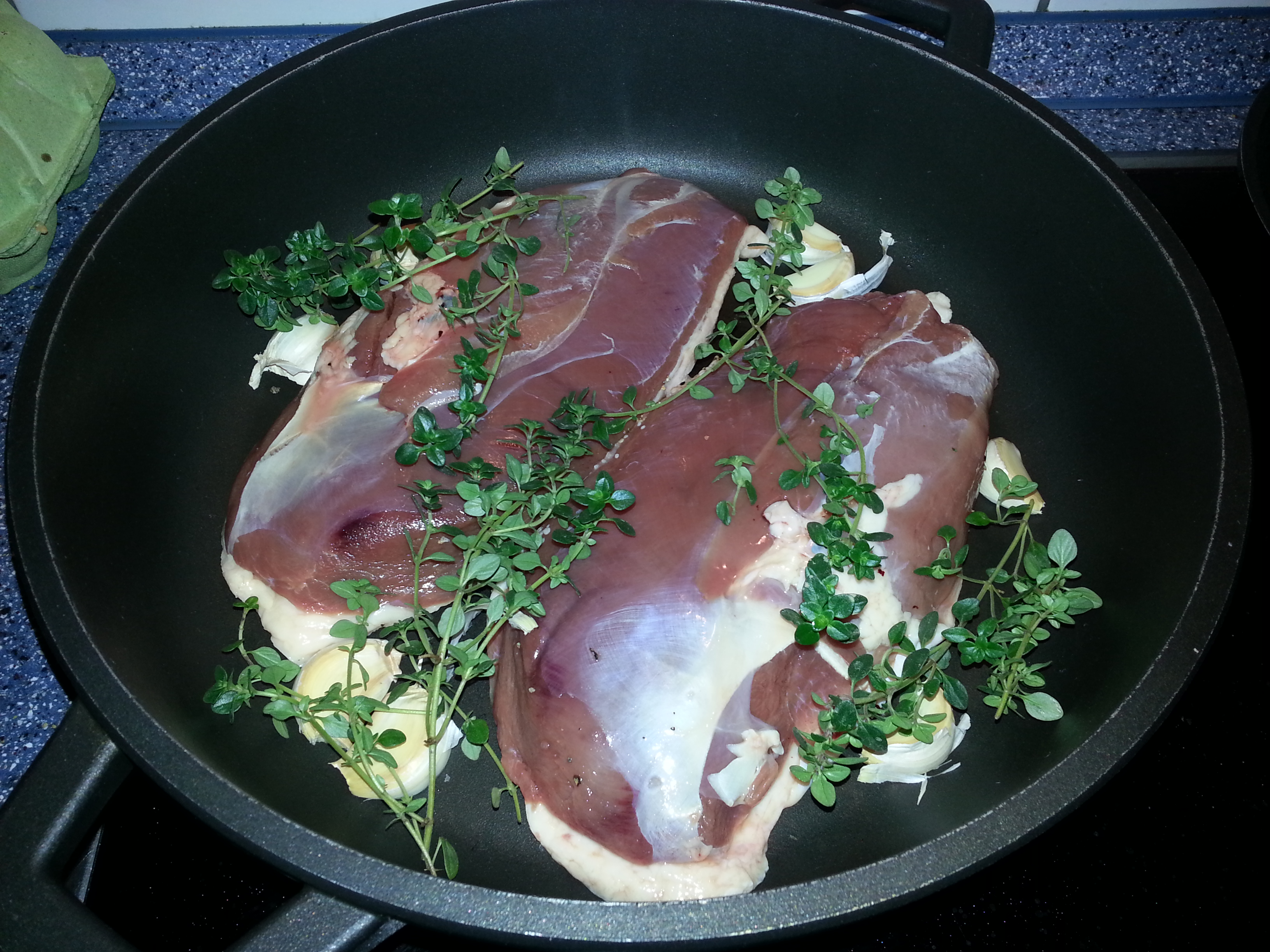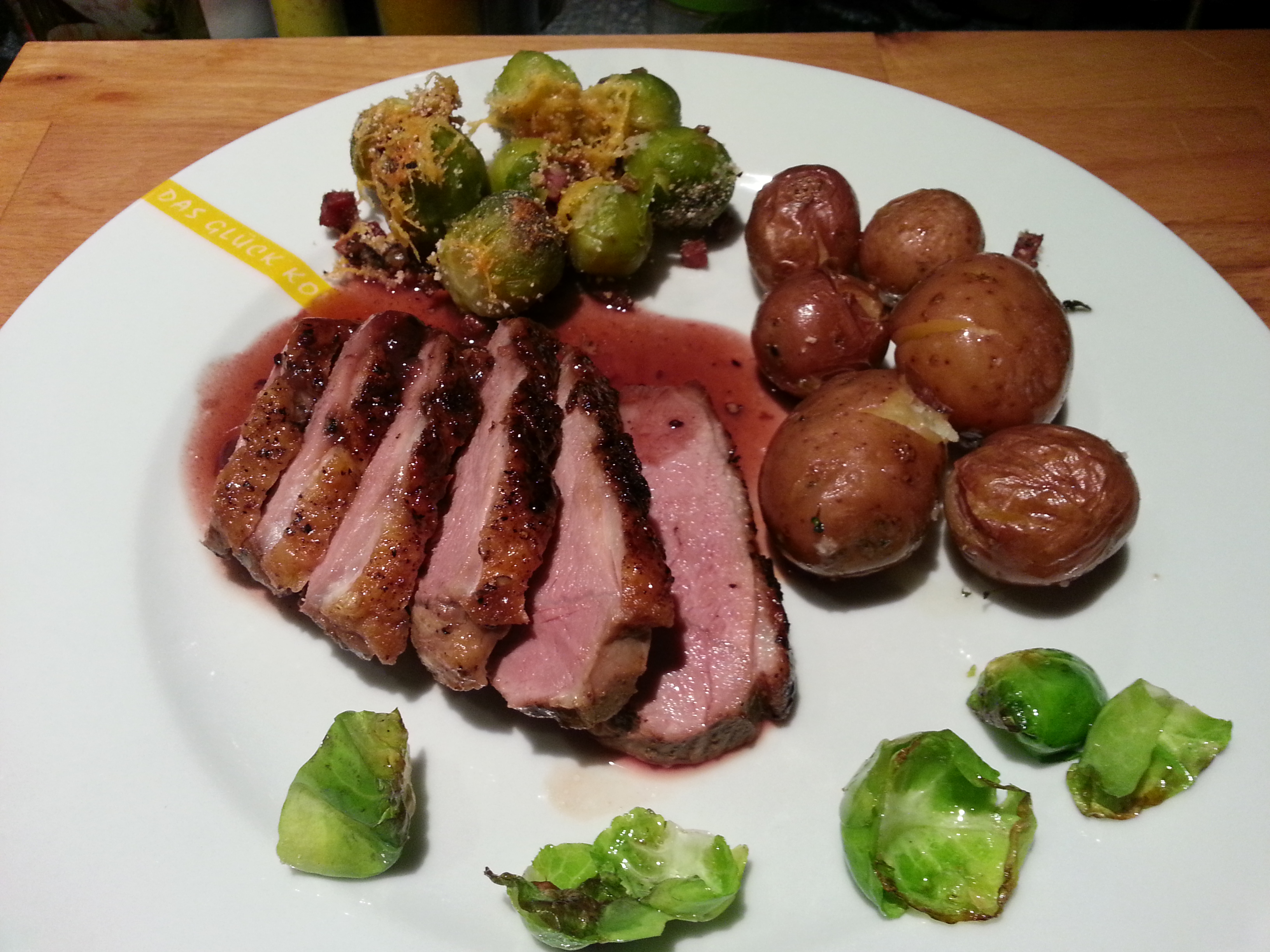 Hauptgang: Entenbrust, Rosenkohl und Kartöffelchen an einer dunklen Portwein-Entensoße
