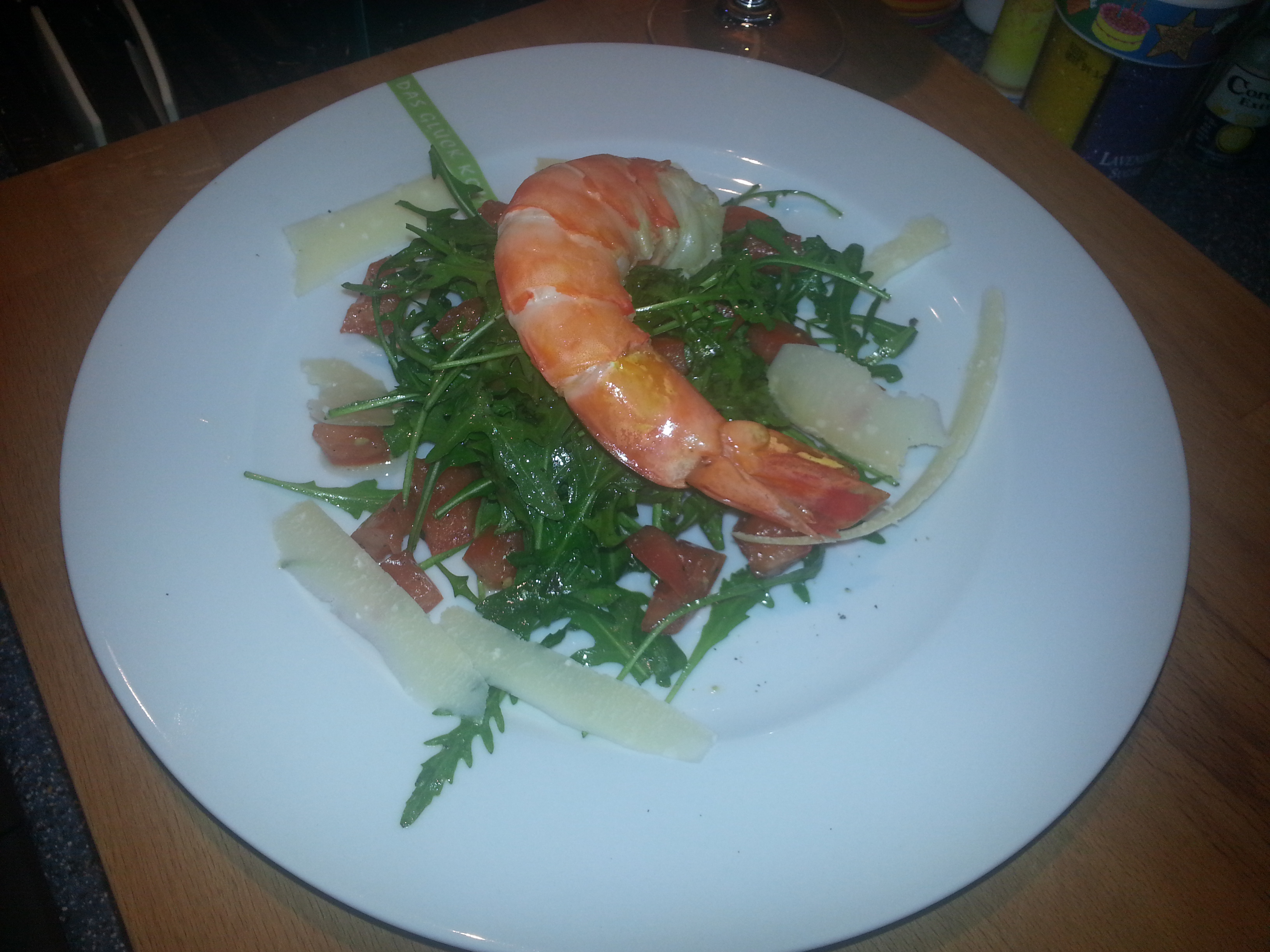Vorspeise: Rucola-Salat mit Tomatenwürfelchen, Parmesanspäne und Garnele