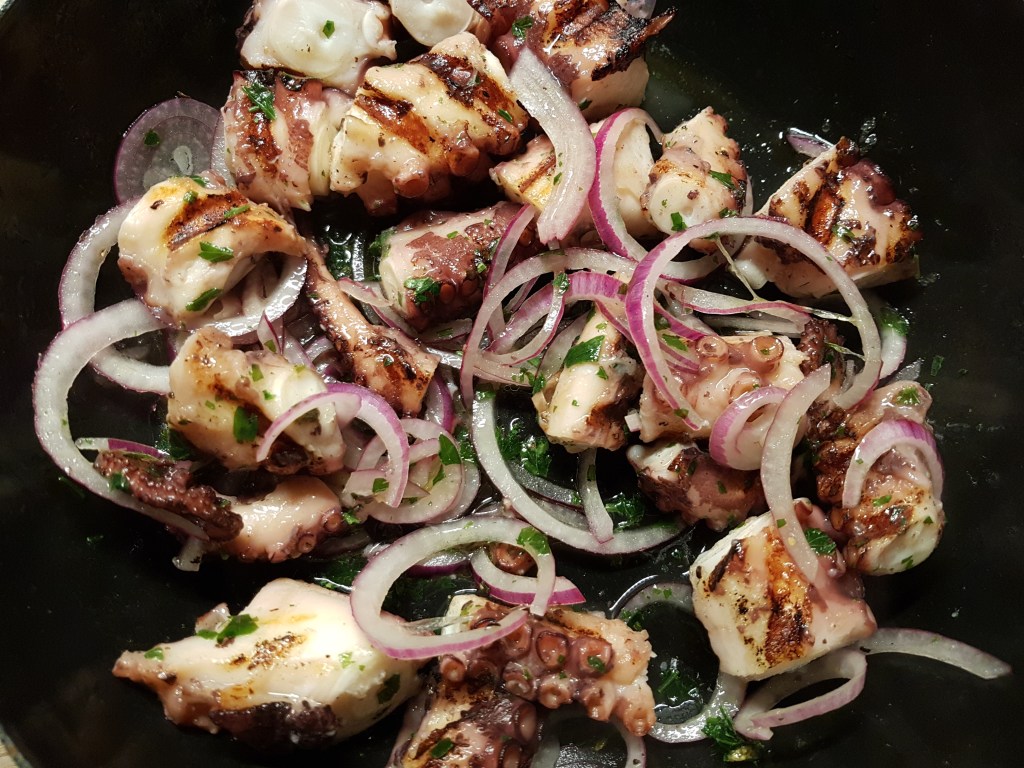 Man kann den Oktopus-Salat in mehreren Varianten zubereiten. Ich habe mal die einfachste gewählt gehe aber weiter unten im Text noch auf weitere Zubereitungen ein.