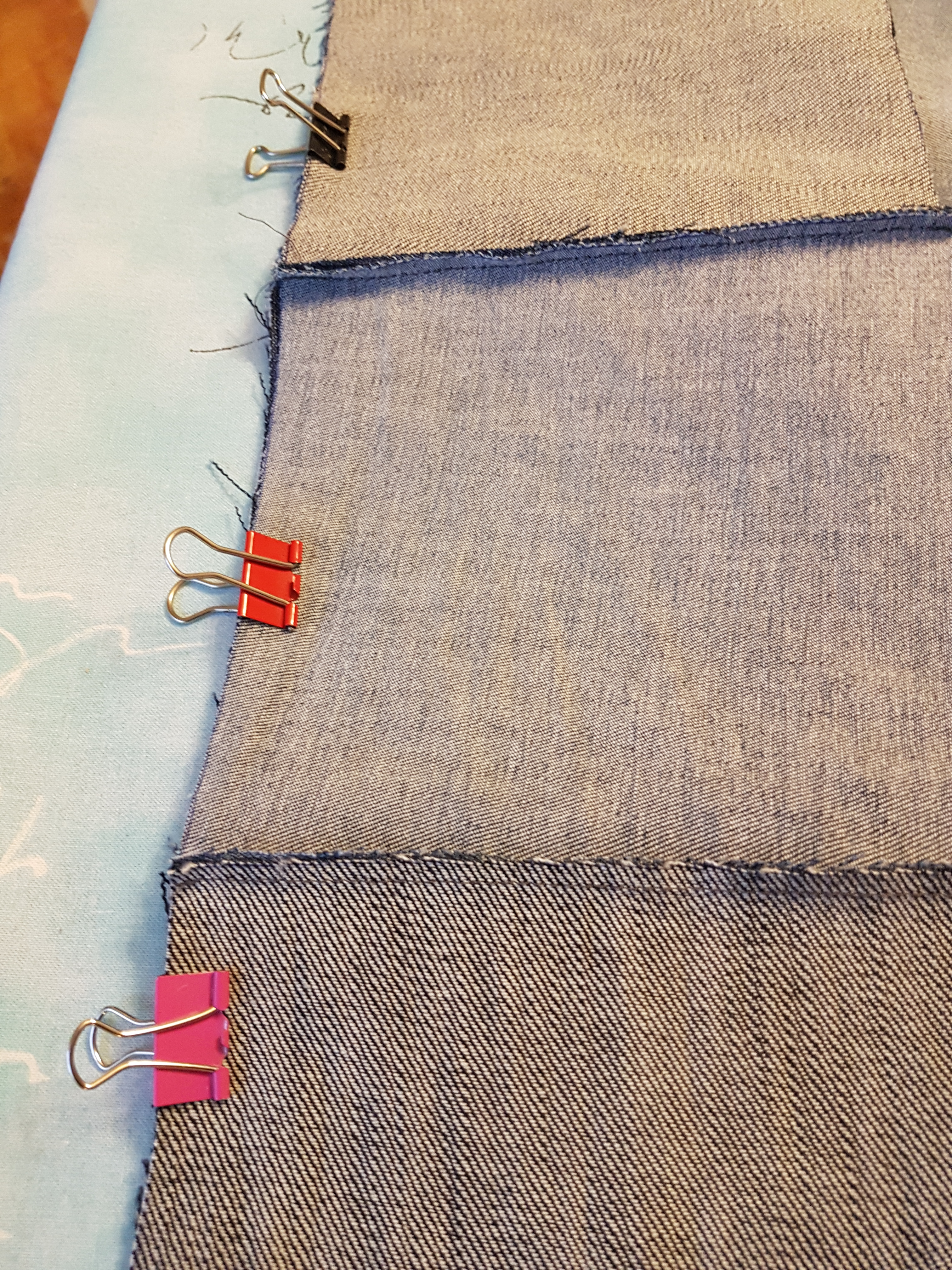Danach folgte das Zusammennähen der Streifen, die ebenfalls rechts auf rechts gelegt wurden. Man kann zum Fixieren Stecknadeln oder auch Backfold-Klammern verwenden.