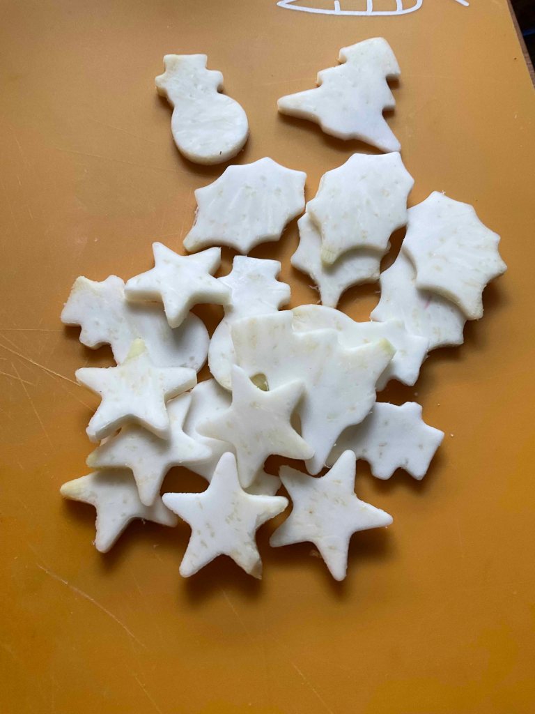 Danach habe ich mir kleine Ausstecher (Kekse) rausgesucht und Formen ausgestochen.