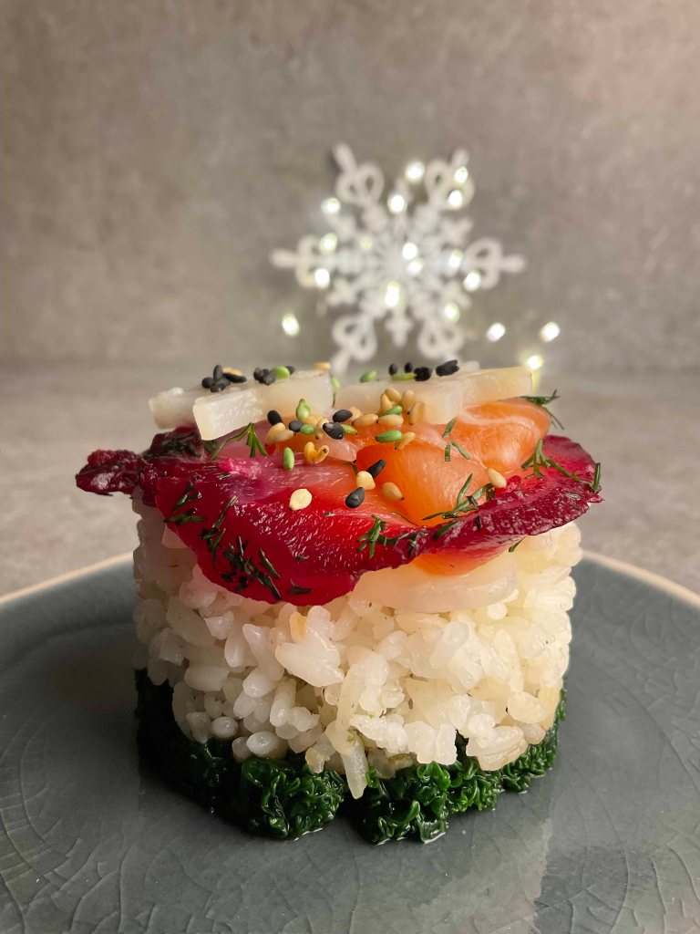 Mit Hilfe eines kleinen Dessertrings aus Edelstahl habe ich dann das Winter-Sushi Türmchen gebaut.