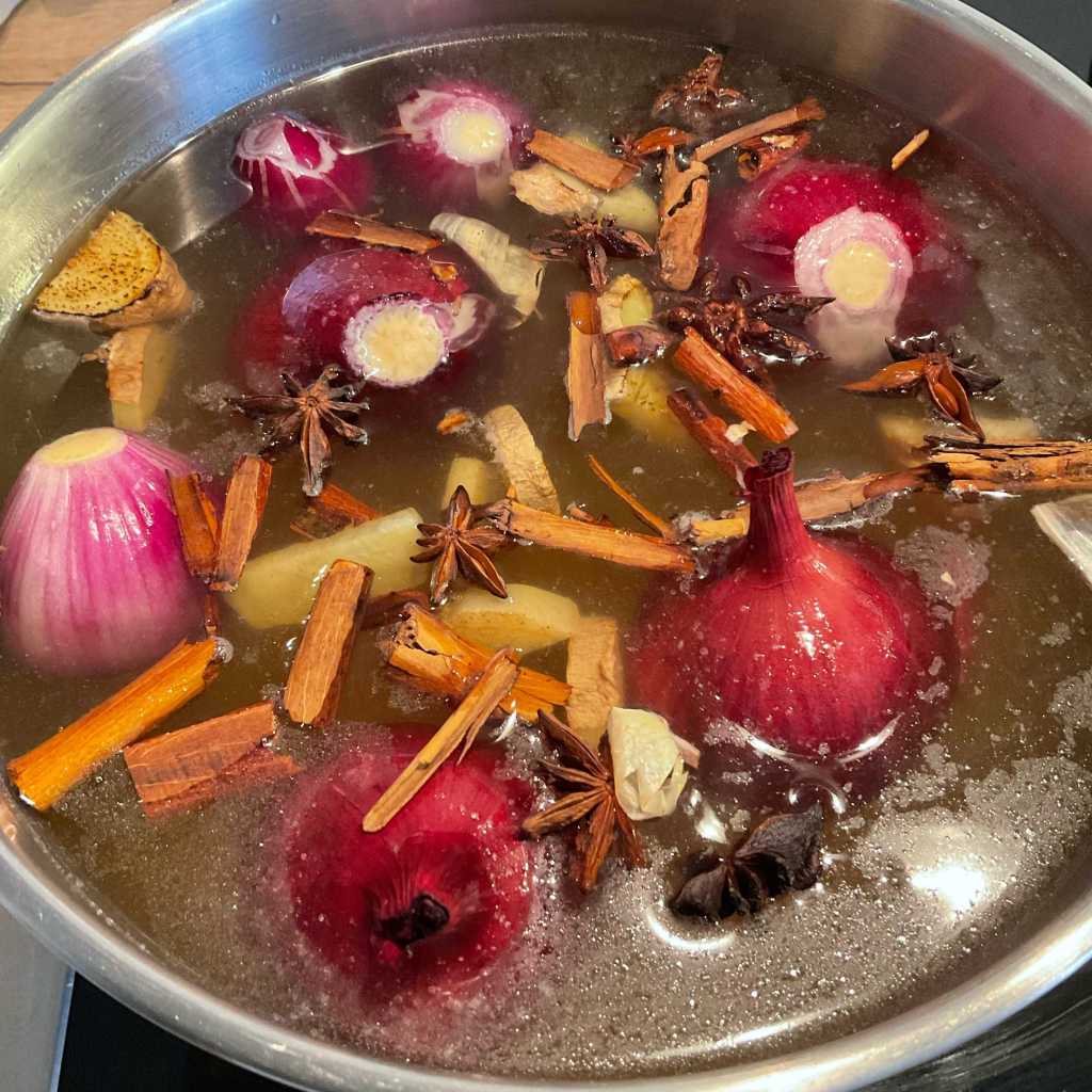Zuerst werden die Zwiebeln halbiert und mit der Schnittfläche nach unten in der Pfanne trocken angebraten, bis die Schnittfläche dunkel ist. Ingwer und Knoblauch ebenfalls anbraten. Wenn alles etwas Farbe genommen hat, Zimt und Anis dazugeben. Die Gewürze werden jetzt wieder zum Leben erweckt.