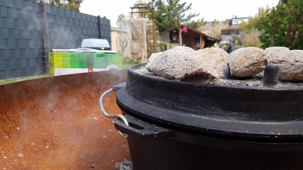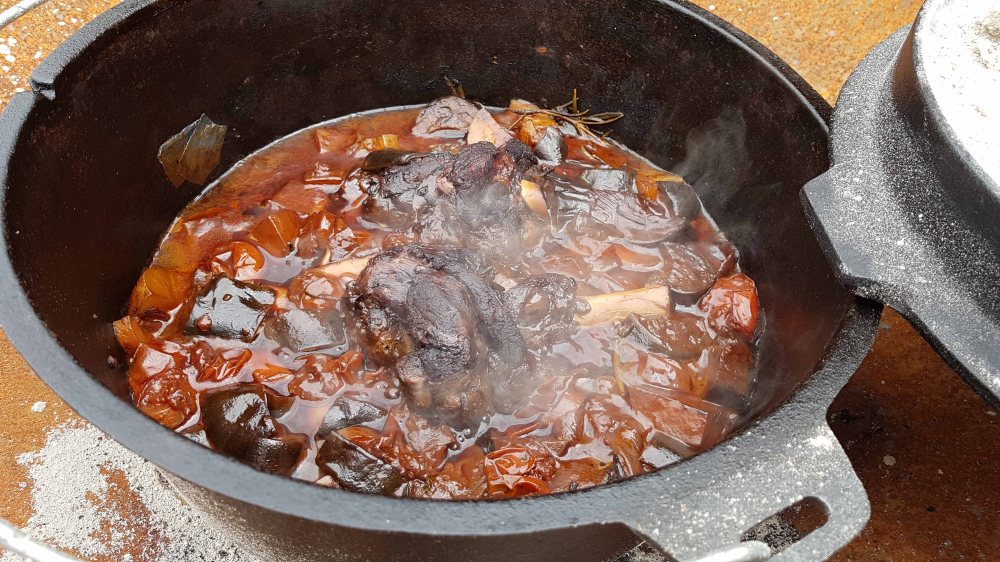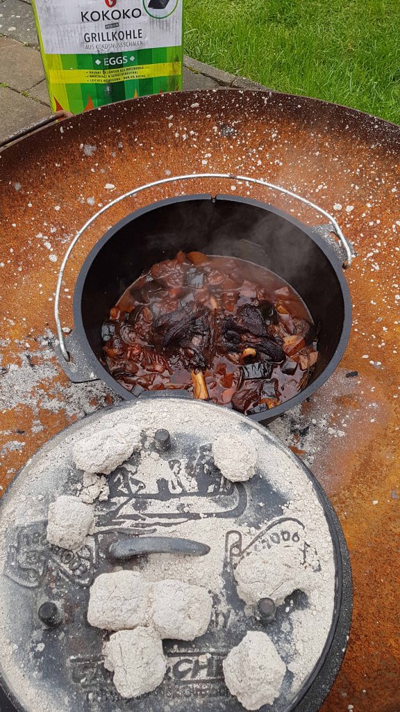 Bei moderater Hitze ( 6-8 Eggs oben, 6 Eggs unten) für 2 Stunden schmoren lassen.