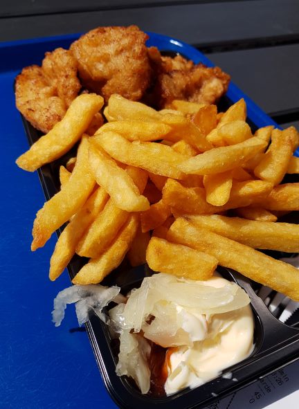 Gelandet sind wir an der Fisch-und Pommesbude am Roten Löwen. Fritten und ne kleine Portion Kibbeling gehen mit knapp 10€ ins Geld. Da war noch kein Getränk bei und die Portion haben wir uns geteilt.