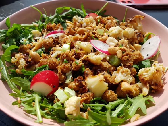 Es war großartig lecker!!!!! Sowohl die Bowl (geröstete Kicherebsen und Erdnüsse) als auch der Kuchen (Brotpudding mit Erdbeeren) waren wahre Geschmackserlebnisse! Jederzeit wieder!