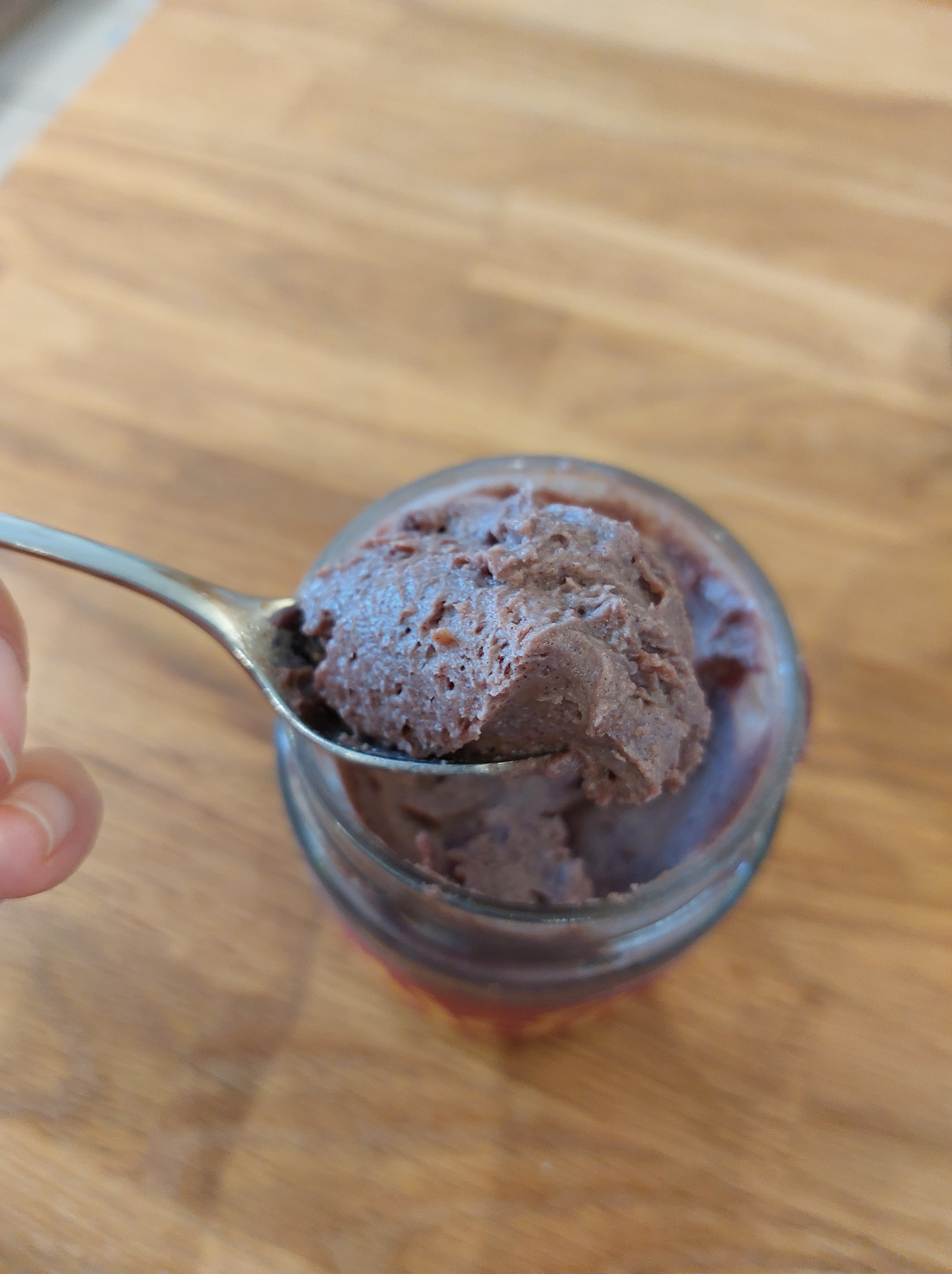 Zuerst mal mit dem Löffel eine Portion rausnehmen und dran schnuppern……yummy! Augen zu und Mund auf! Wow!