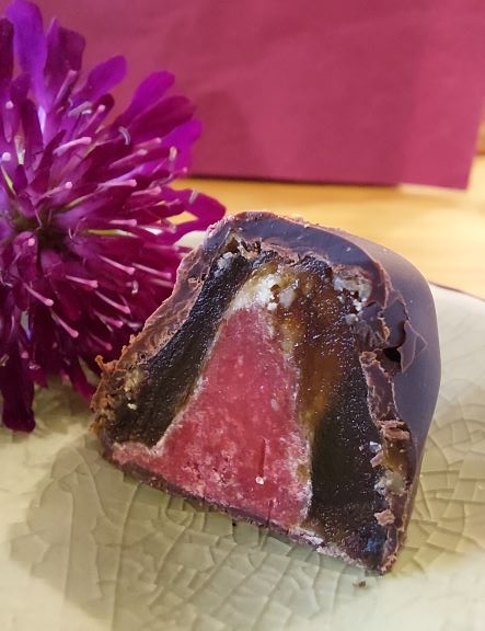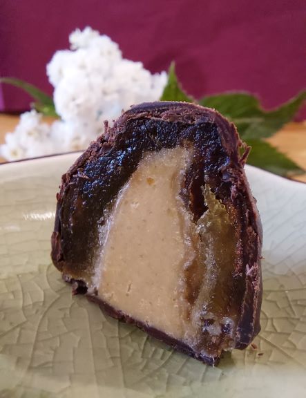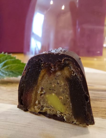 Ich sage: Schokolade und als Gegenspieler die Marakuja ist ein Klassiker, der hier sehr gut in Szene gesetzt wird. Eine cremige, fruchtige Füllung mit leichter Säure passt wunderbar zur Dattelüße und der Schokolade.