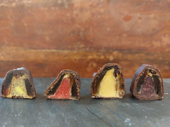 - Maracuja Madness ist Frucht pur. Die Säure der (echten) Maracuja ist ein super Gegenspieler zu der gehaltvollen Dattel und zu der dunklen Schokolade.