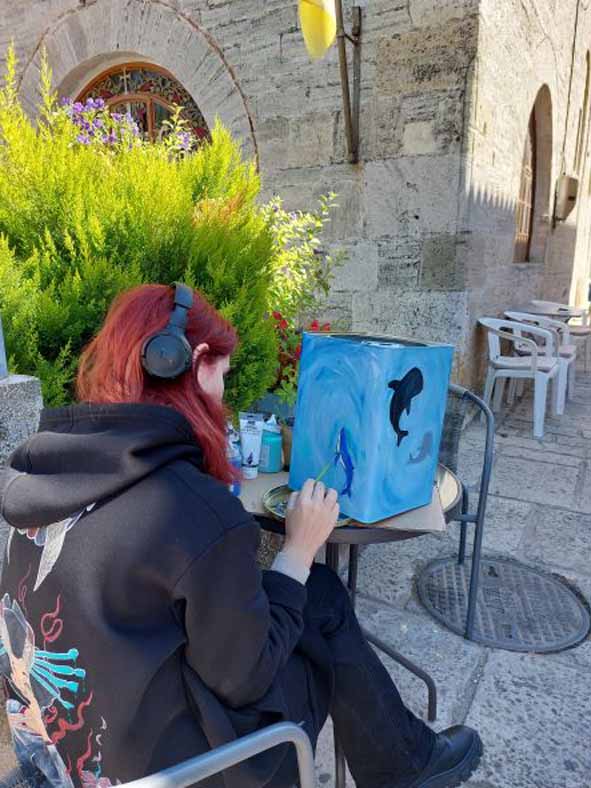 – das kleine Fischerdorf Afytos, kleiner hübscher Dorfkern mit nettem Dorfkern und vielen kleinen Läden mit schönen Dingen. Ganz Afytos ist eine Kunstausstellung. Überall stehen wunderschön bemalte große Metalldosen