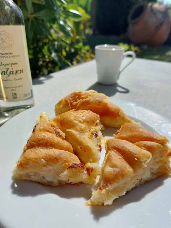 Wie erwähnt nahmen wir die Einladung zur Käse Pie (Tiropita) an. Sakis verwöhnte uns mit der Pie, Kaffee und einem lauschigen Plätzchen im Garten. Unsere Vorräte haben wir nochmal aufgestockt und sind erleichtert, dass es die Produkte in Düsseldorf bei Taste Greece zu kaufen gibt.
