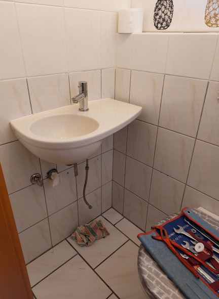 Es kam der Tag, an dem wir das alte Waschbecken von der Wand nehmen wollten, die Streicharbeiten sollten ja auch mal beginnen. Du demontierst Wasserhahn, Siphon und Wasserleitungen…..besser gesagt du willst das alles entfernen. Tja, Pustekuchen. Das Eckventil ließ sich nicht schließen, es musste ein neues Eckventil her und eingebaut werden. Glücklicherweise haben wir einen Nachbarn vom Fach. Der hat das mal eben erledigt.