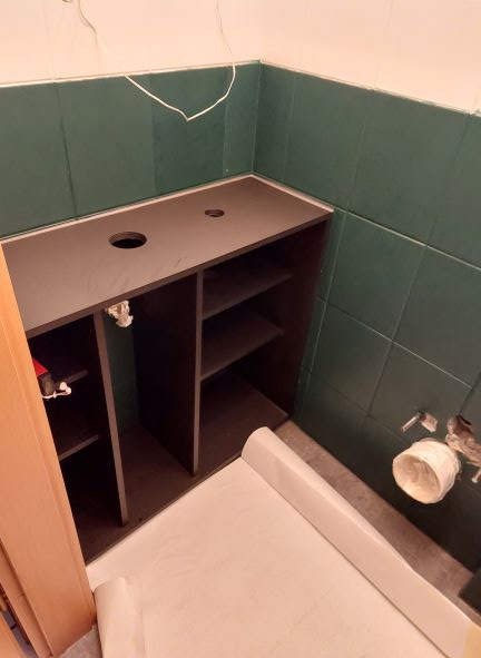 Nächster Schritt, der Waschtischunterschrank. Mein Mann hatte den auf Maß saugend in die Lücke konstruiert.