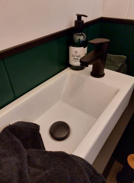 – Waschtisch Armatur (normale Armatur umgebaut auf Kaltwasser, Ablauf ersetzt für Waschtische ohne Überlauf), Eckventil, Siphon und Anschlüsse – Bauhaus