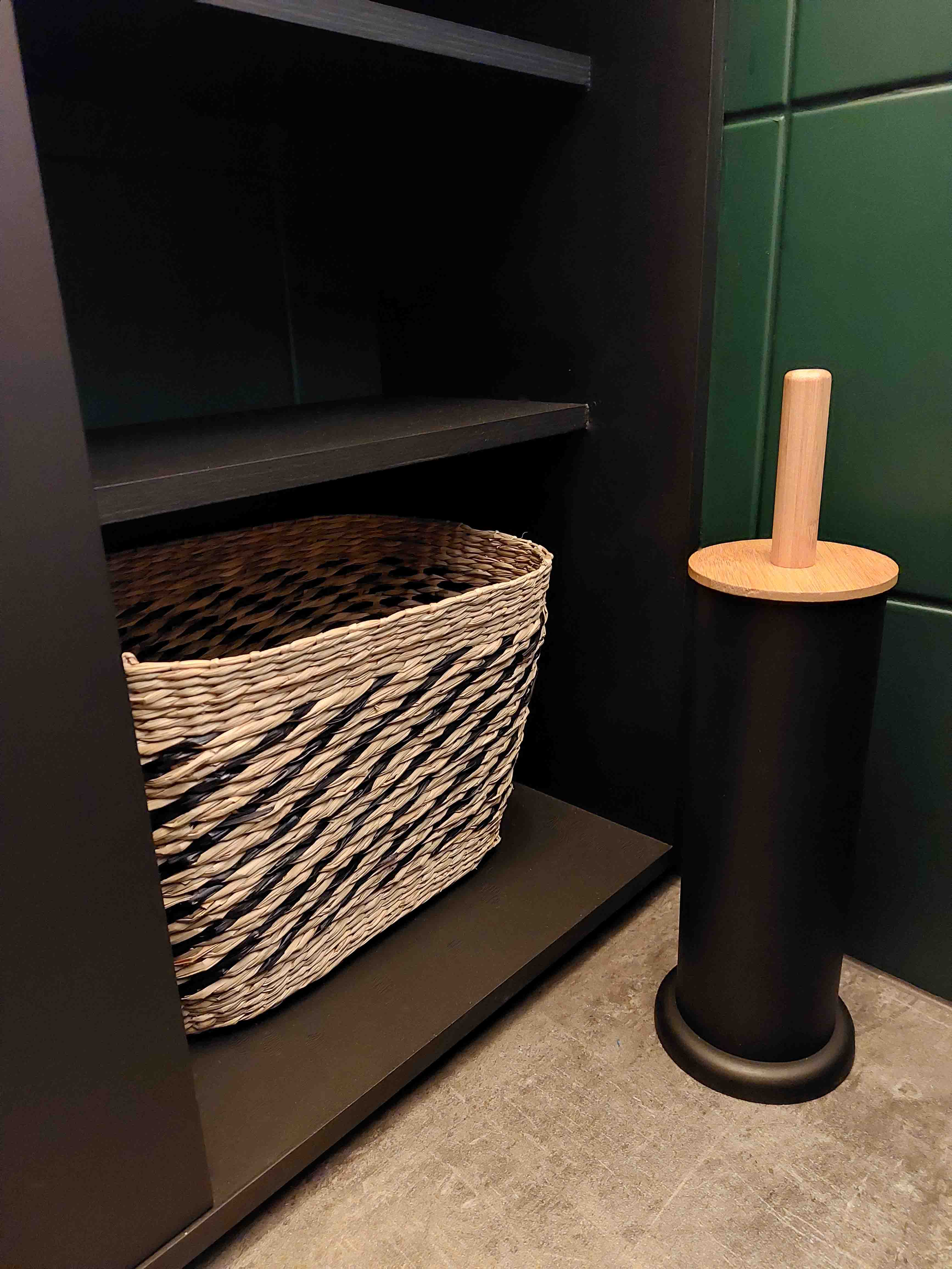 Die Grenzen zwischen weiß und dunkelgrün habe ich mit einer Tapetenleiste in matt schwarz kaschiert, das sieht mega cool (und sauber) aus. Die Leisten sind einfach mit Montagekleber auf die Fuge geklebt. Das Zuschneiden der Leisten hat meinen Mann noch weitere Nerven gekostet, denn keine der Ecken hatte einen rechten Winkel.