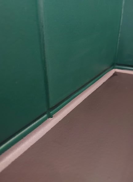 Aus Papier habe ich eine Schablone vom Fußboden angefertigt und auf den PVC übertragen, geschnitten und mit doppelseitigem Klebeband im Gästeklo verklebt. Hammer! Das sieht echt genial aus. Die Ränder habe ich mit anthrazitfarbenem matten Silikon versiegelt. Das ergab einen schönen Wandanschluß.