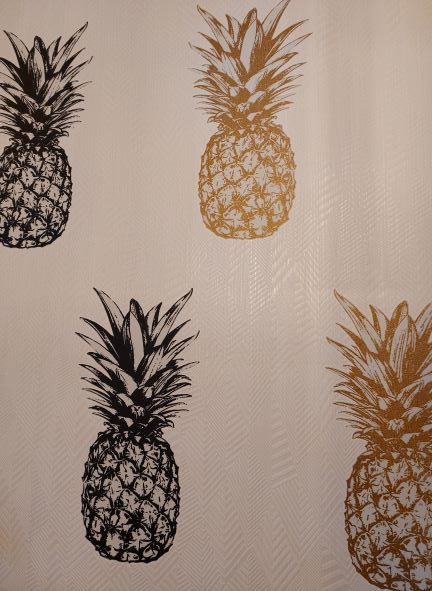 Die Steintapete hatte ich zwischenzeitlich gegen eine schicke Designertapete getauscht. Weiß mit goldenen und schwarzen Ananas (ein Schelm der Böses dabei denkt). So eine abgefahrene Tapete!