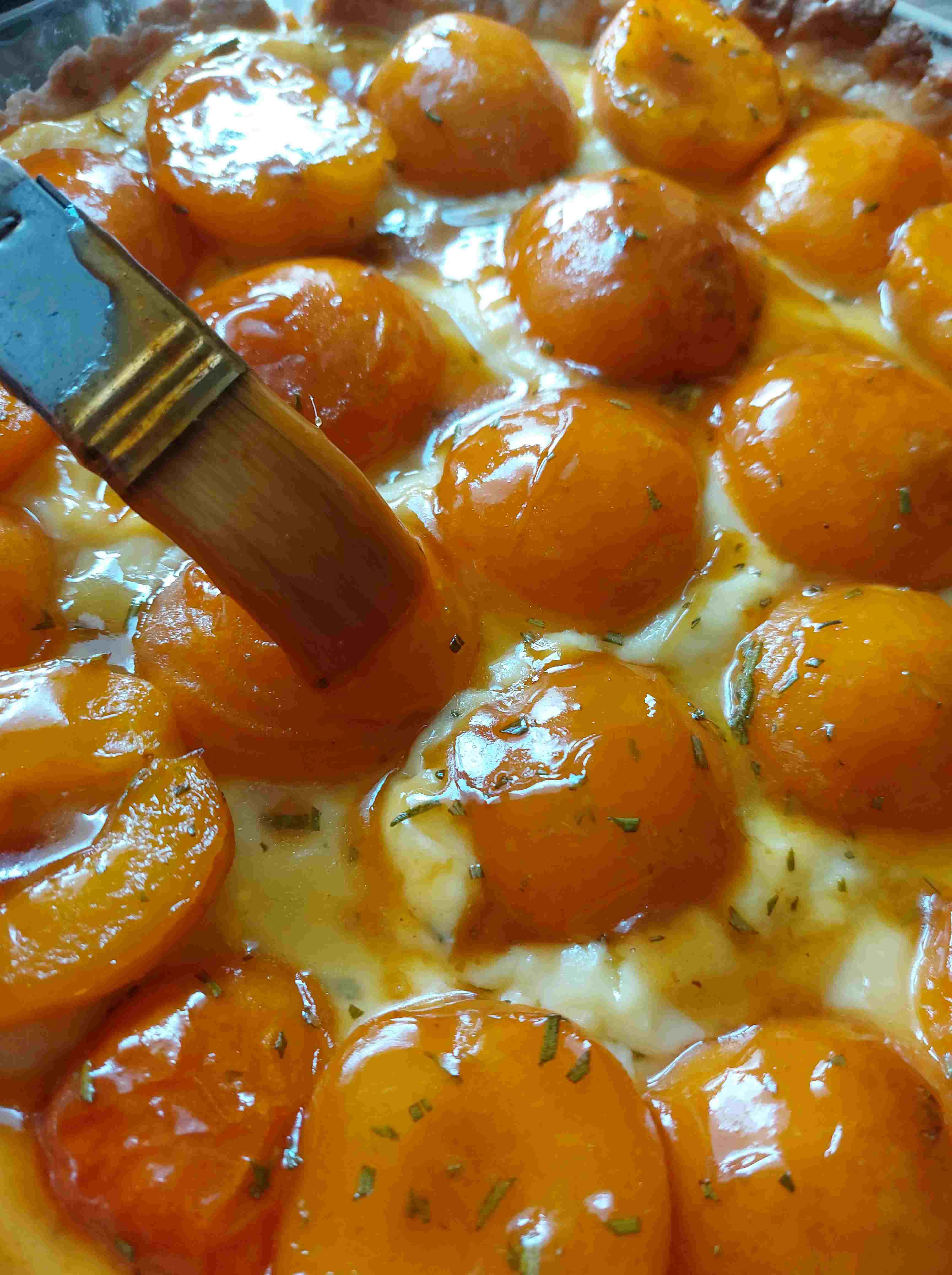 Tarte nach der Backzeit aus dem Ofen nehmen, Aprikosen mit der Glasur bepinseln und anschließend nochmals für 5min in den Ofen geben.
