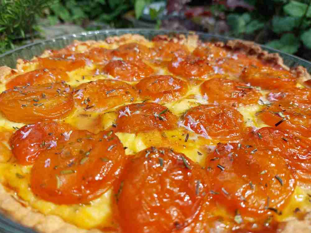 Tarte auskühlen lassen und als Garnitur mit gehacktem Rosmarin bestreuen.