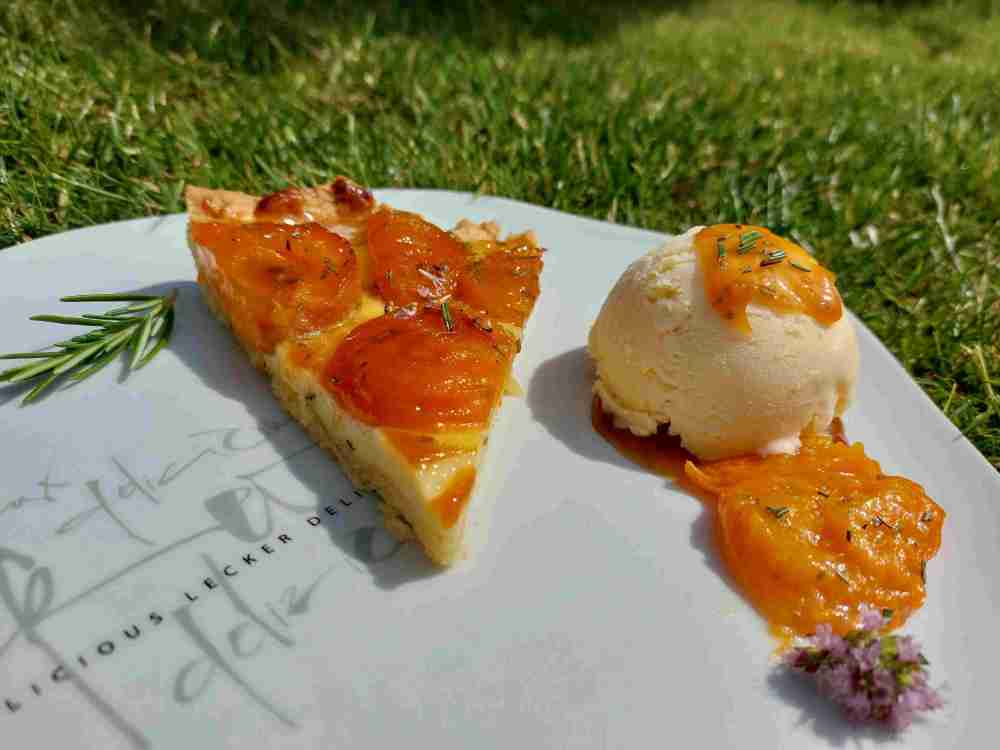 Ich habe dazu ein selbstgemachtes Vanilleeis gereicht, zudem ich den restlichen Aprikosensud und noch Reste der gegarten Aprikosen (die nicht mehr auf die Tarte gepasst haben) garniert habe.