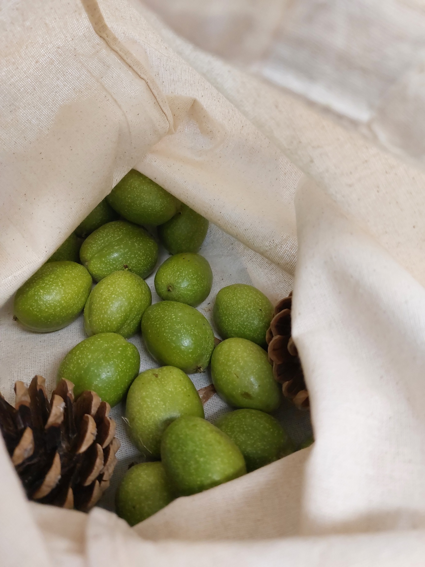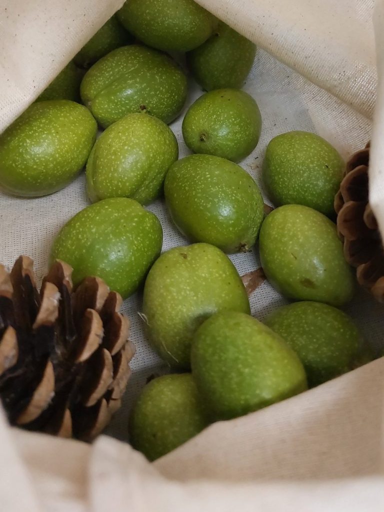 Wie erwähnt müssen die Walnüsse noch am Baum hängen, die Farbe der Schale ist satt grün und sie sind noch ein wenig weich. Die Ernte sollte bis Ende Juni erfolgt sein.