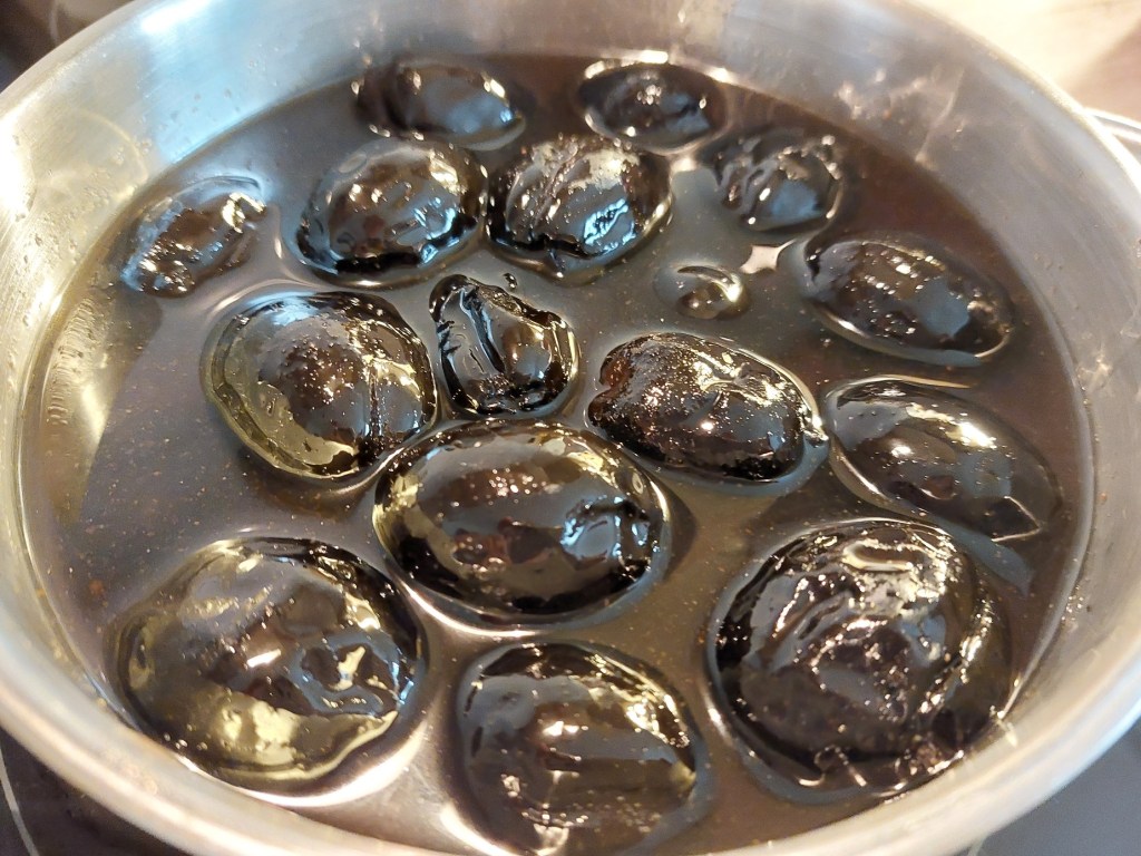 Süß: Den Sud durch ein Sieb abgießen und über die schwarzen Nüssen geben.