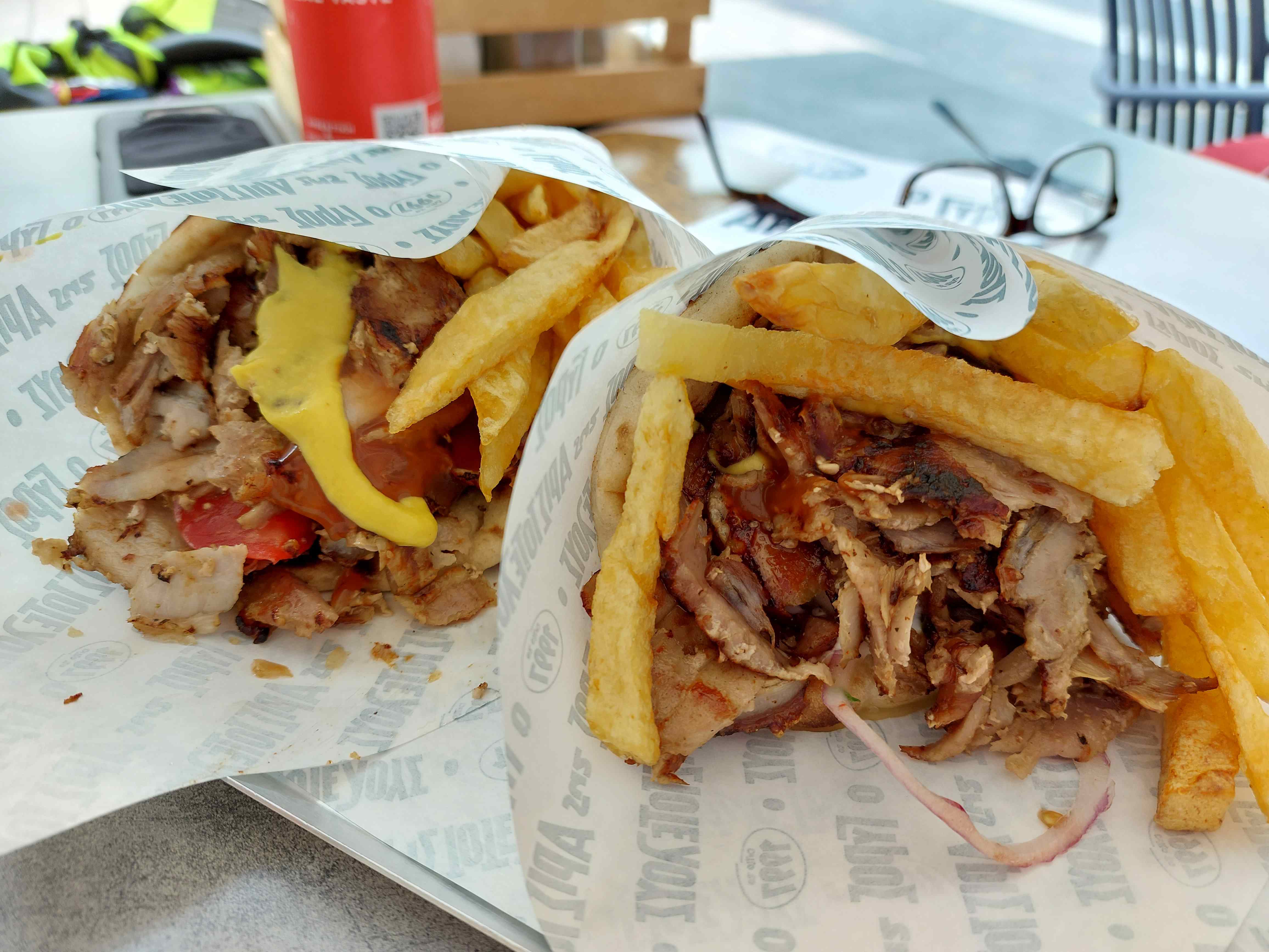 Direkt am Patia Aristoteles. Da drehen riesen Drehspieße ihre Runden, es sieht einfach alles köstlich aus. Wir haben immer die klassische Gyros-Pita bestellt weil sie einfach köstlich ist. Perfekt gewürzt und saftig. Auch der Bauernsalat hat super geschmeckt. Es ist immer viel los, es lohnt sich aber definitiv auf einen freien Platz zu warten. Die Wartezeiten sind nicht so lang.