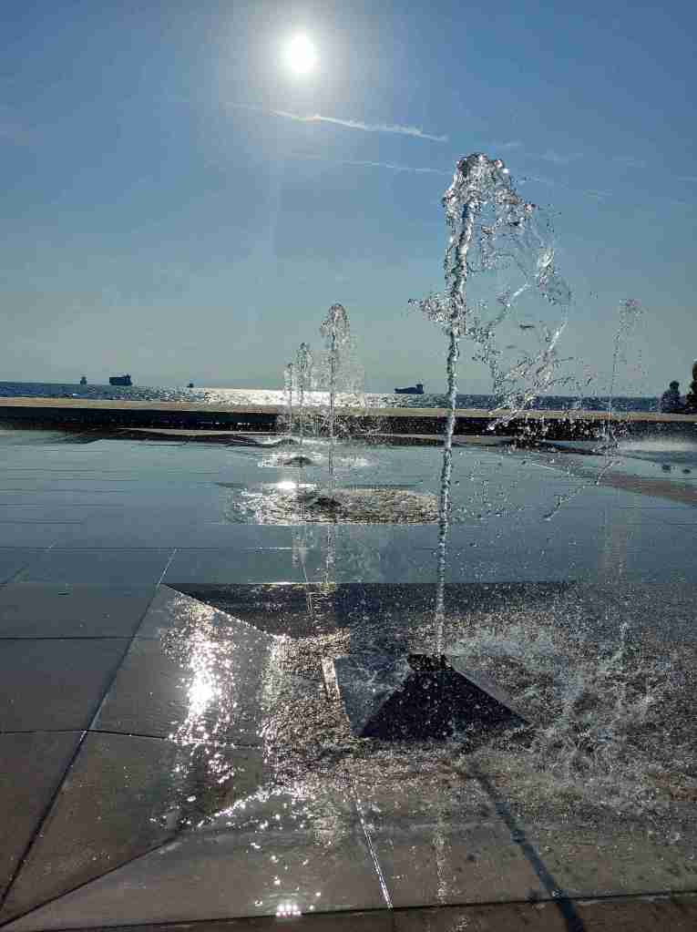 Gehst du weiter an der Promenade entlang kommst du zum Denkmal von Alexander dem Großen und noch ein Stück weiter folgend, die Wasserbecken mit den vielen Fontänen bevor du an die bekannte Skulptur mit den Regenschirmen kommst. Ein schönes Fotomotiv.