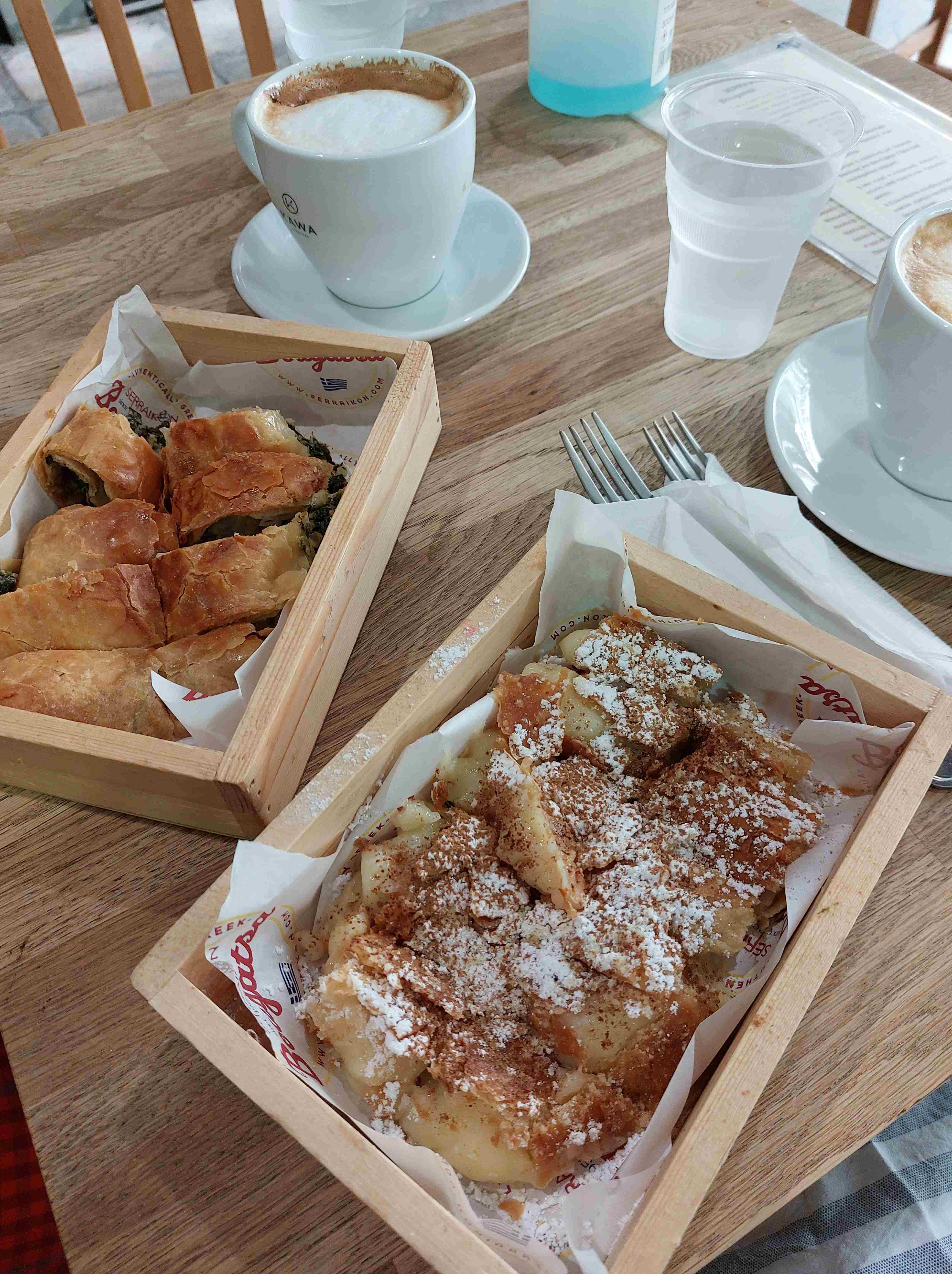 Kurzer Spaziergang zu Serraikon Bougatsa, dort gibt es ganz klassisch die absolut köstliche Bougatsa (ich liebe Crema oder Feta) aus eigener Herstellung und noch weitere süße und salzige Varianten und Spezialitäten. Dazu einen Kaffee und der Tag kann starten.