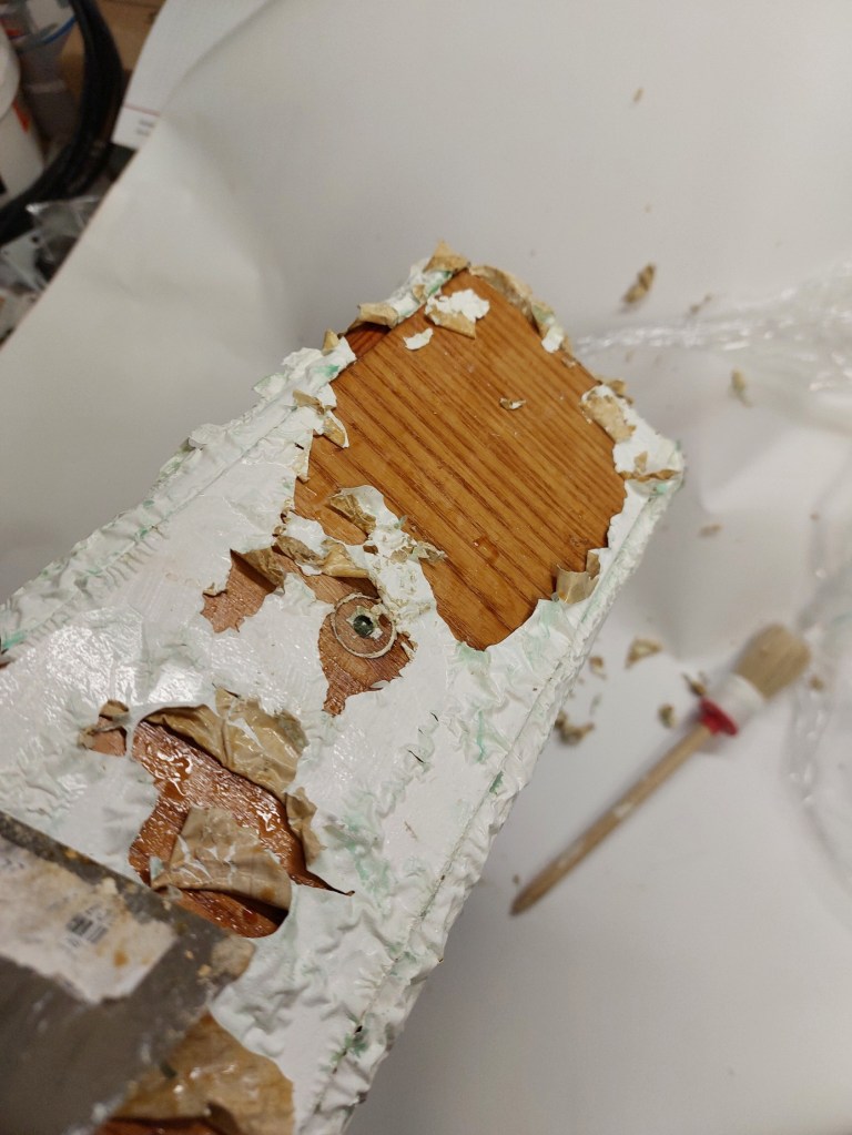Die nächste Hürde war die Abdeckplatte. Ich hatte erfolgreich verdrängt, dass ich damals die Korkauflage einfach überstrichen hatte. Es fiel mit erst dann wieder ein als der Abbeizer die Oberfläche ich eine klebrige Matschepampe verwandelt hatte. So ein Mist!