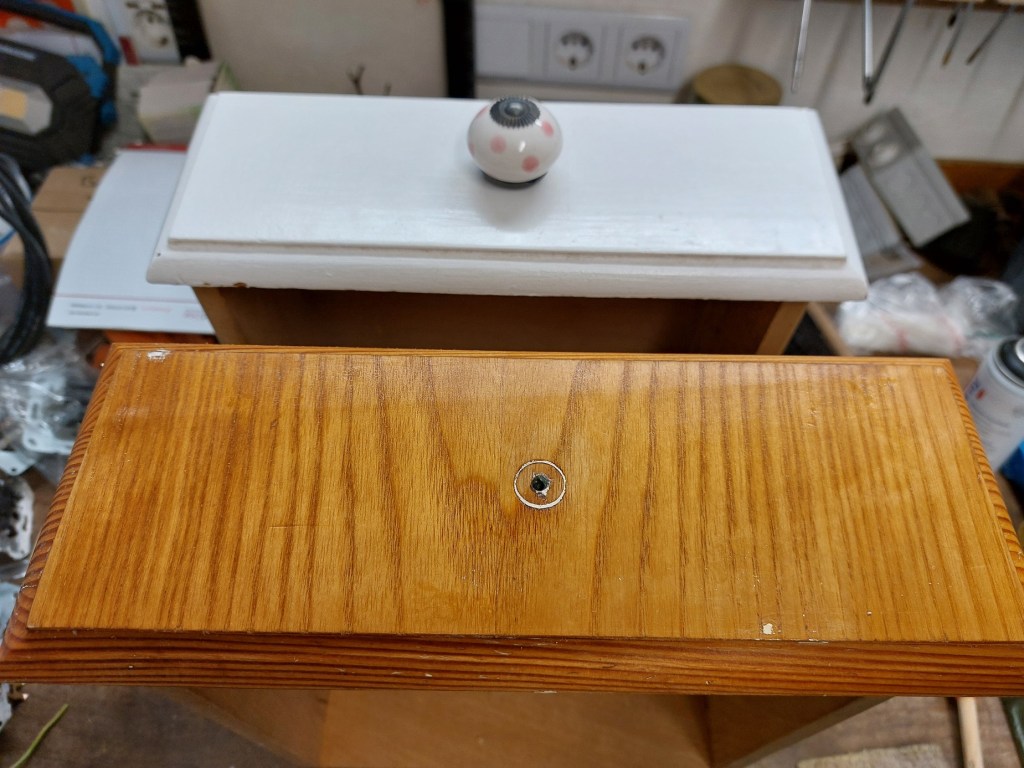 In der Zwischenzeit nahm ich mir den Korpus des Schränkchens vor. Er hatte an den Seiten einige Löcher und Macken die erst repariert werden mussten. Auch da folgten, schleifen und lackieren.