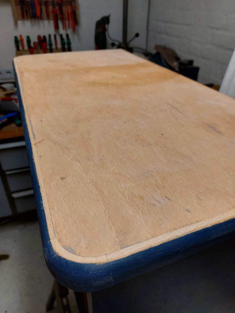 Und, was soll ich sagen? Man kann ja auch mal Glück haben. Unter der matschigen Schicht kam unversehrtes Holz zum Vorschein. Die Schicht ließ sich relativ gut entfernen und es blieben nur wenige Klebereste übrig die ich anschließend einfach weggeschliffen habe.