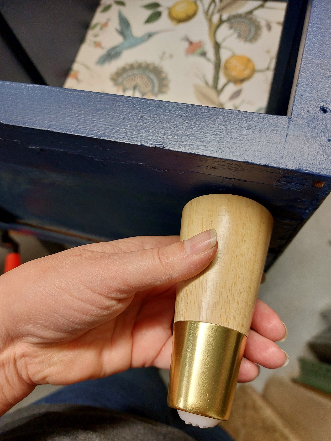 Für das Schränkchen hatte ich mir eine Tapete mit wunderschönem Design ausgesucht. Die Farben passten wunderbar zu dem dunklen Blau und den goldenen Griffen. Ein sehr schöner Kontrast wie ich finde. Wider Erwarten war die Tapete top. Nicht zu dünn, nicht zu dick.