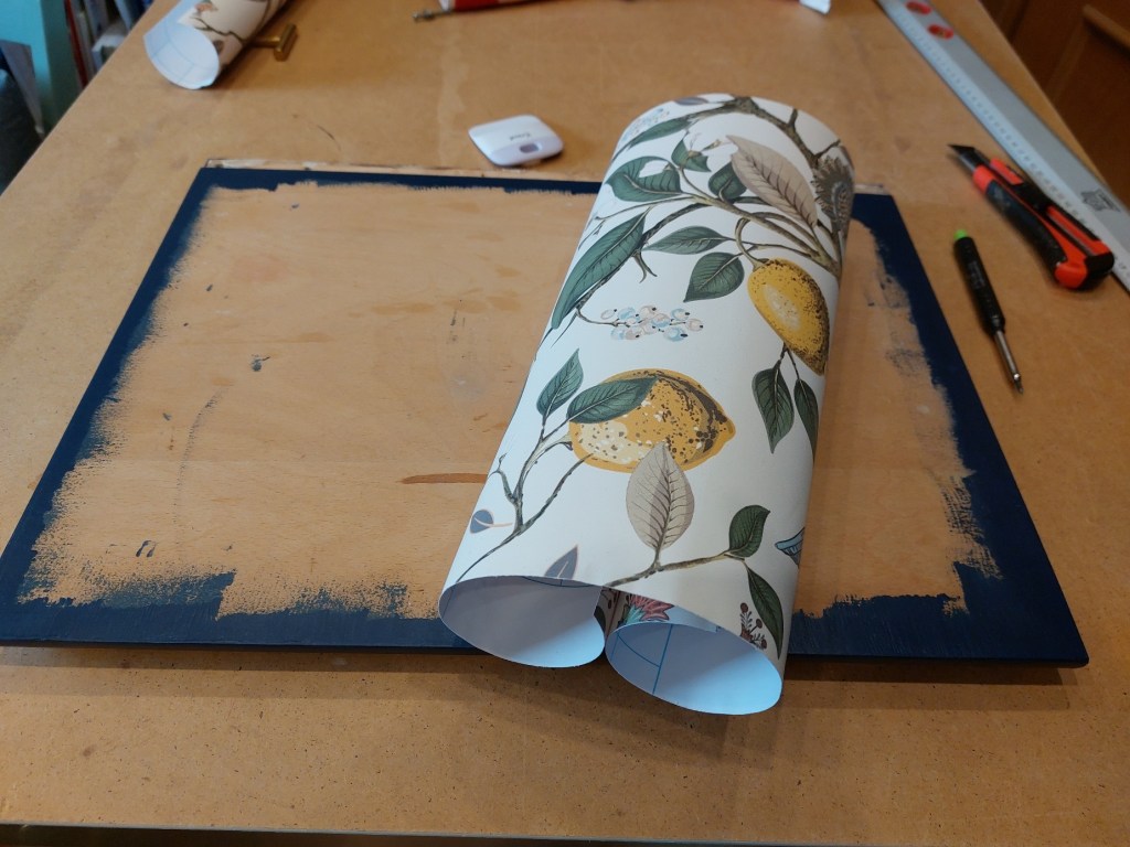 Weil das so einfach hab ich flux die Tapete für die Türeninnenseite zugeschnitten und ebenfalls aufgeklebt. Sah echt perfekt aus bis ich beim Zusammenbau bemerkte, dass das Design auf dem Kopf stand…….nun ja, wer nix arbeitet macht auch keine Fehler….. abgefummelt, neu zugeschnitten und diesmal in der richtigen Ausrichtung verklebt.