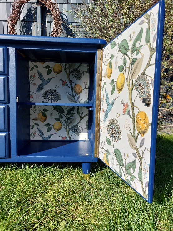 Den Innenraum des Faches mit der Tür und den Einlegeboden (wurde erneuert) habe ich ebenfalls dunkelblau gestrichen, nur die Rückwand (innen) habe ich ausgespart, da sollte ja die Tapete dran.