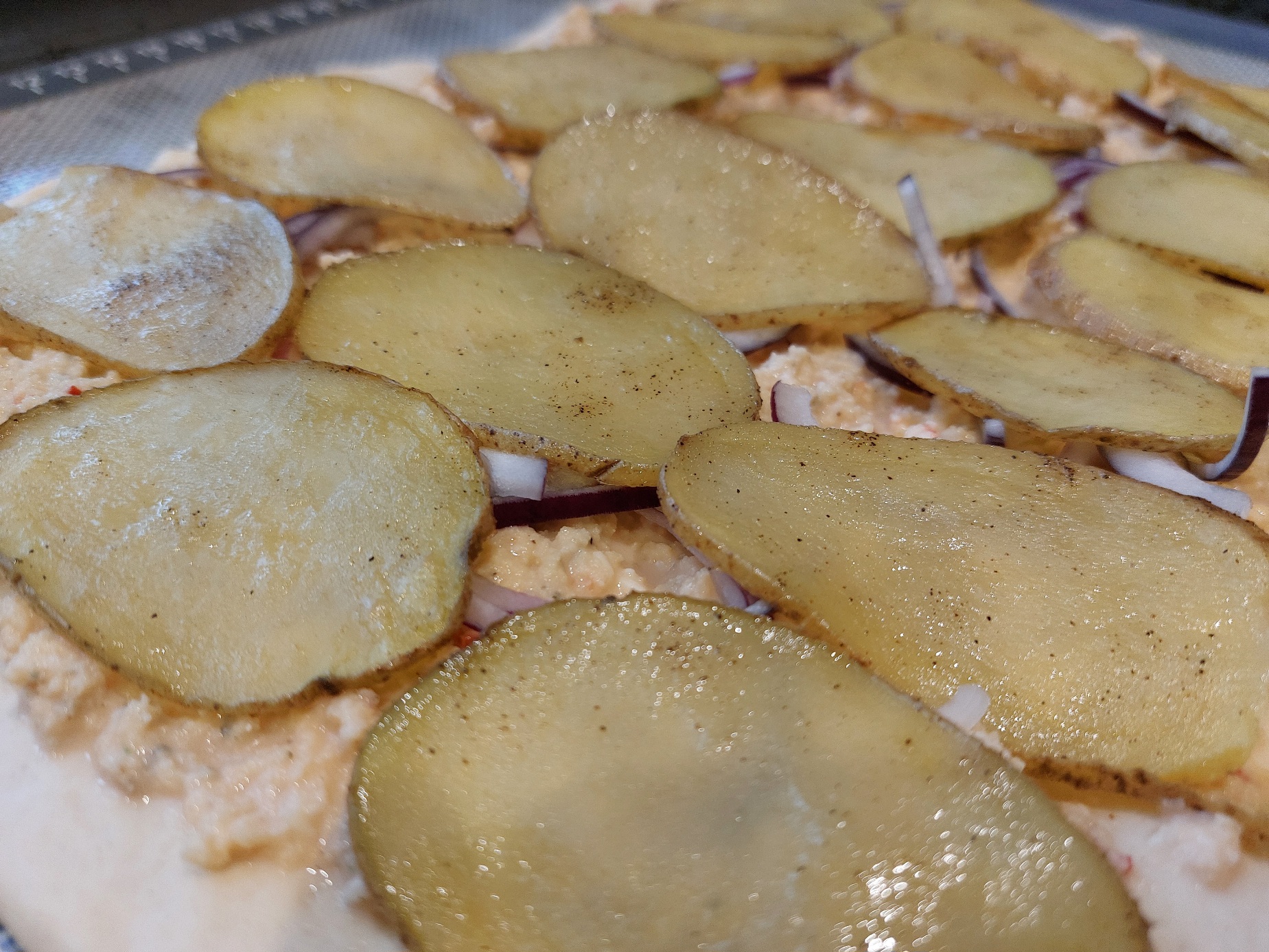 Im Ofen bei 230°C Umluft backen bis der Teig goldbraun und die Kartoffeln eine schöne Farbe haben.