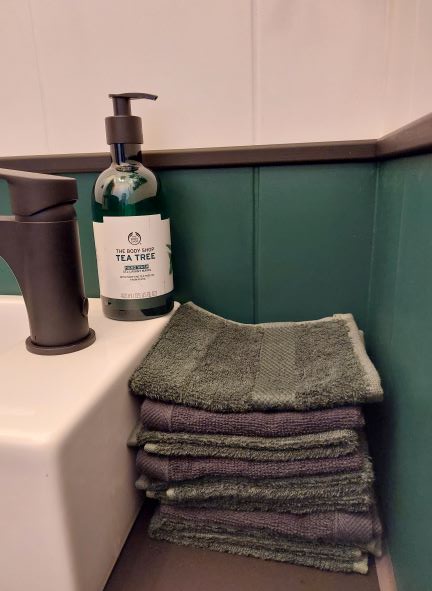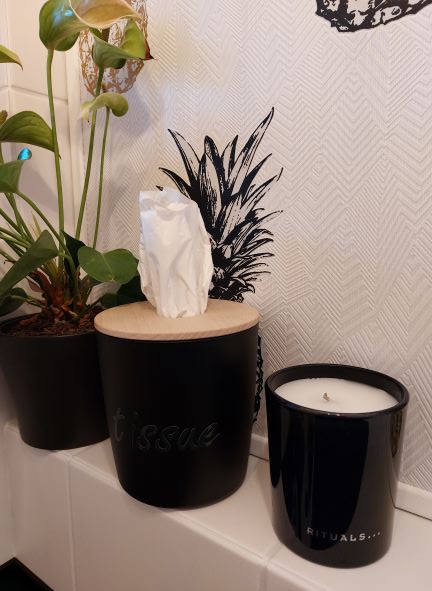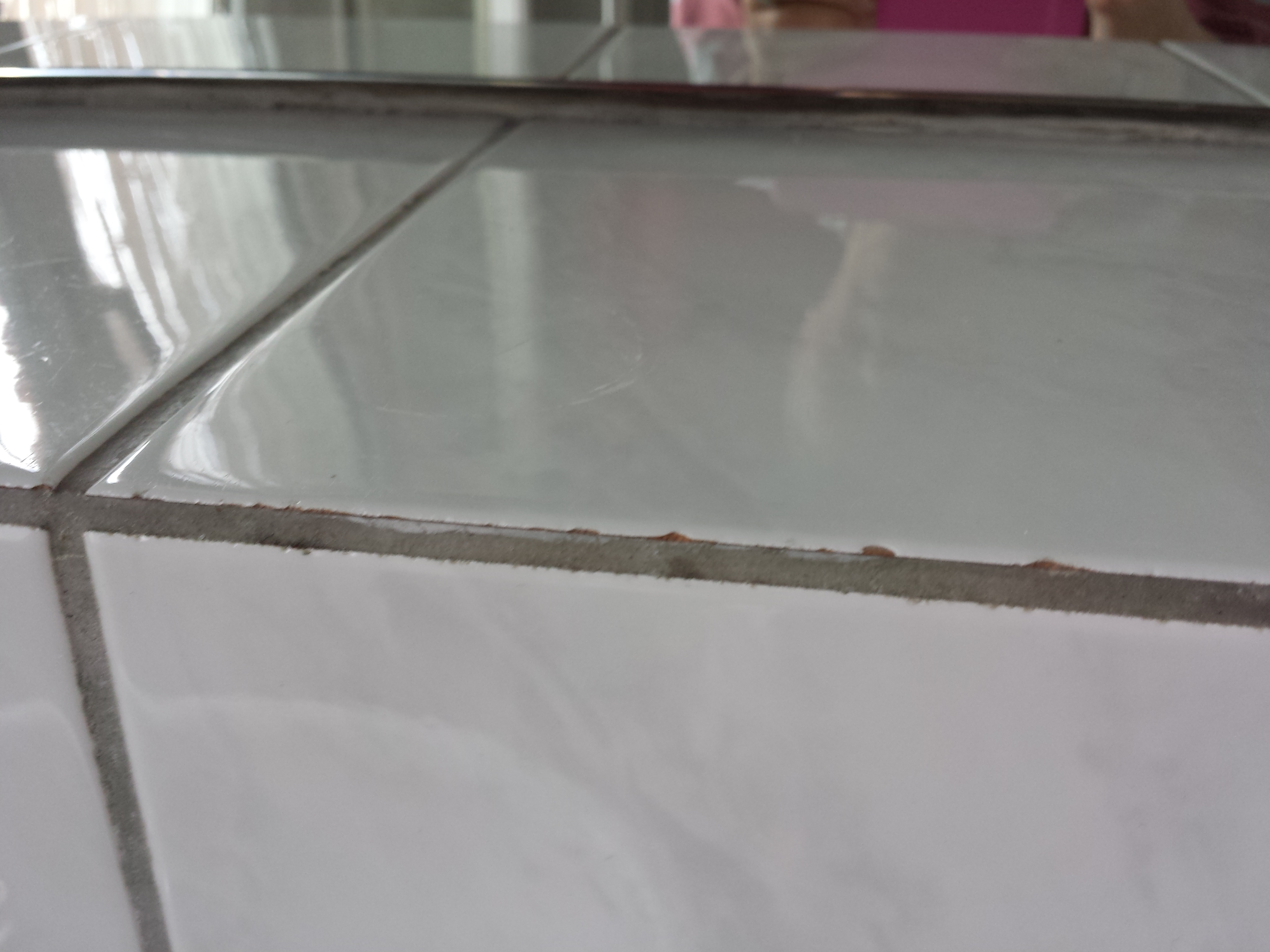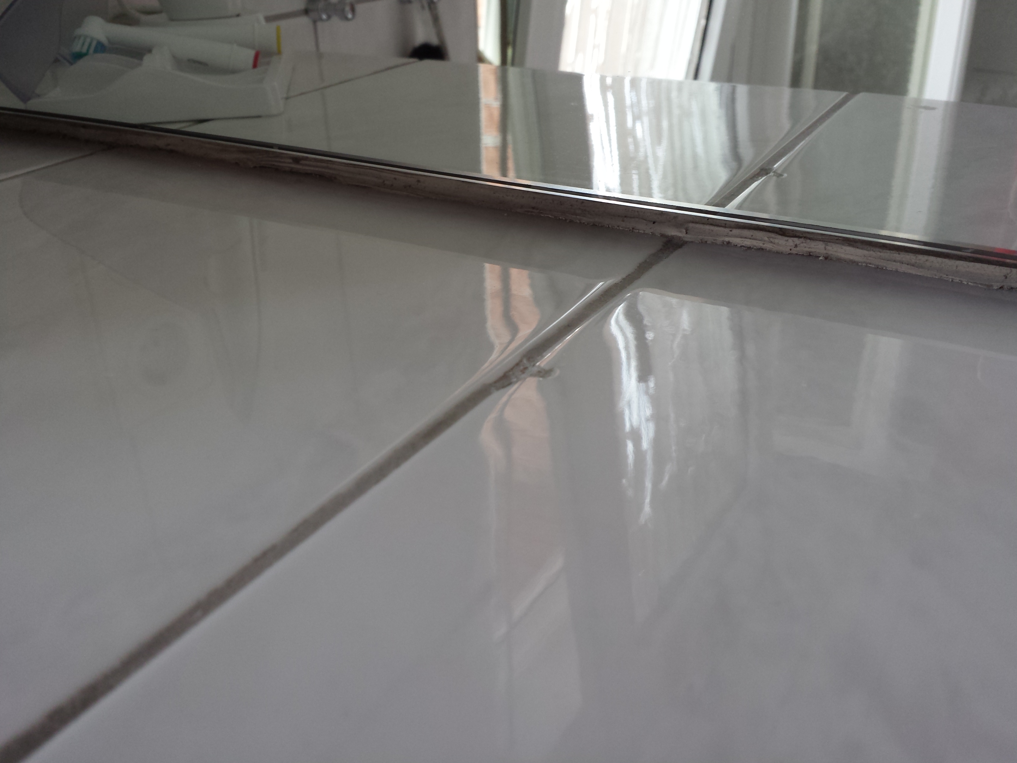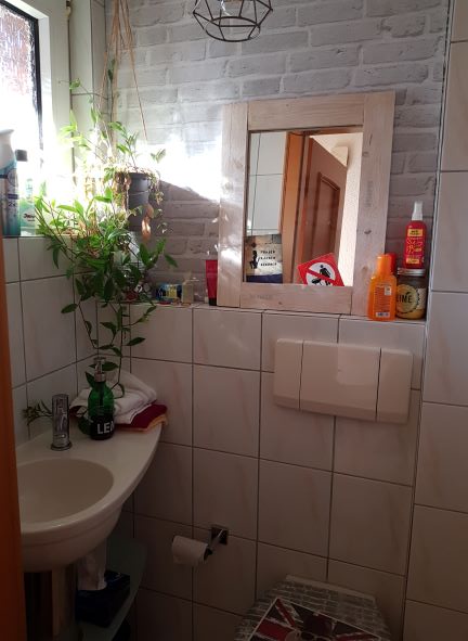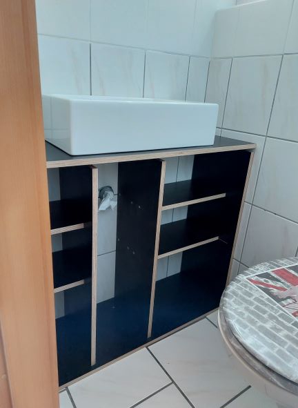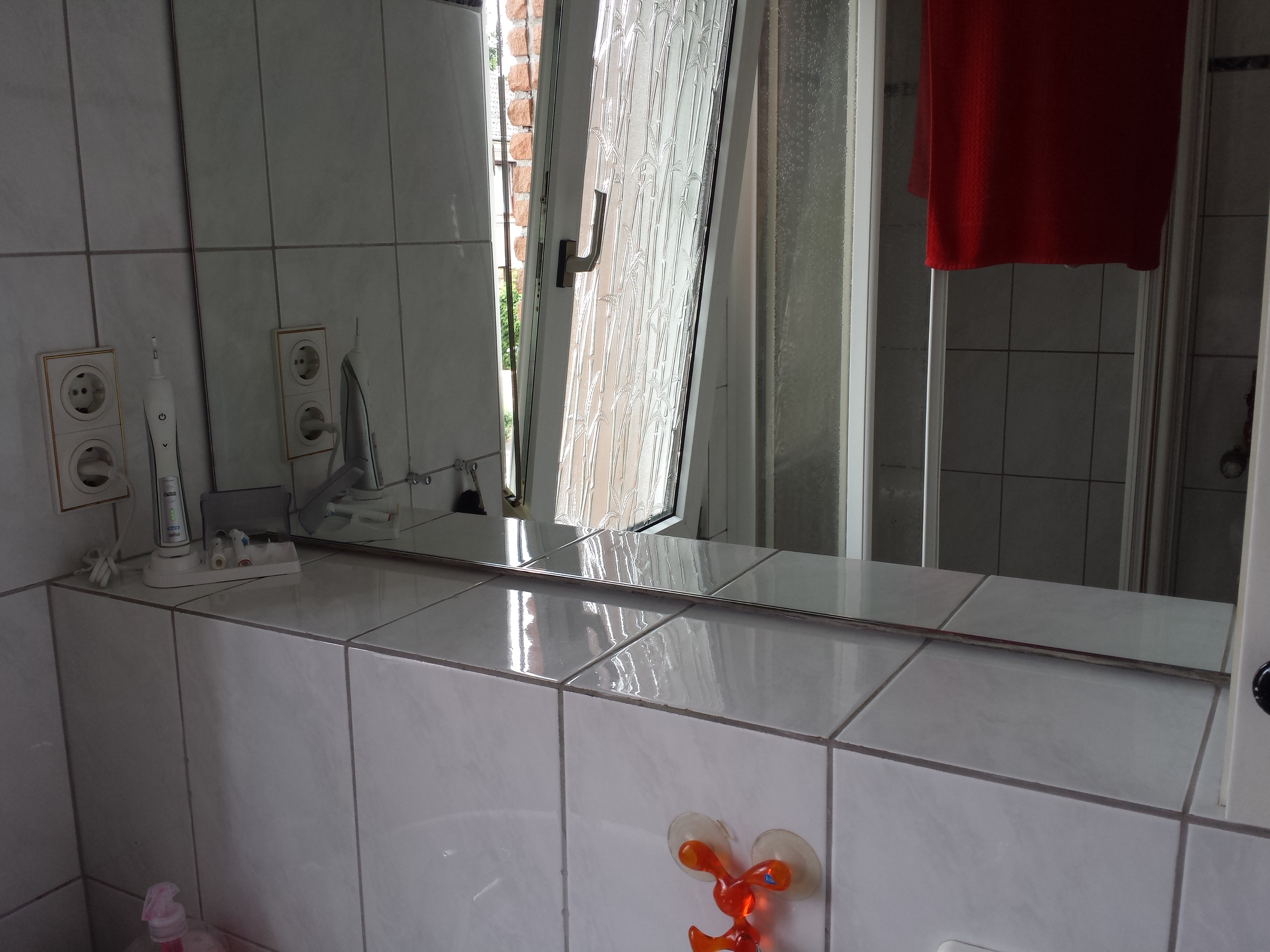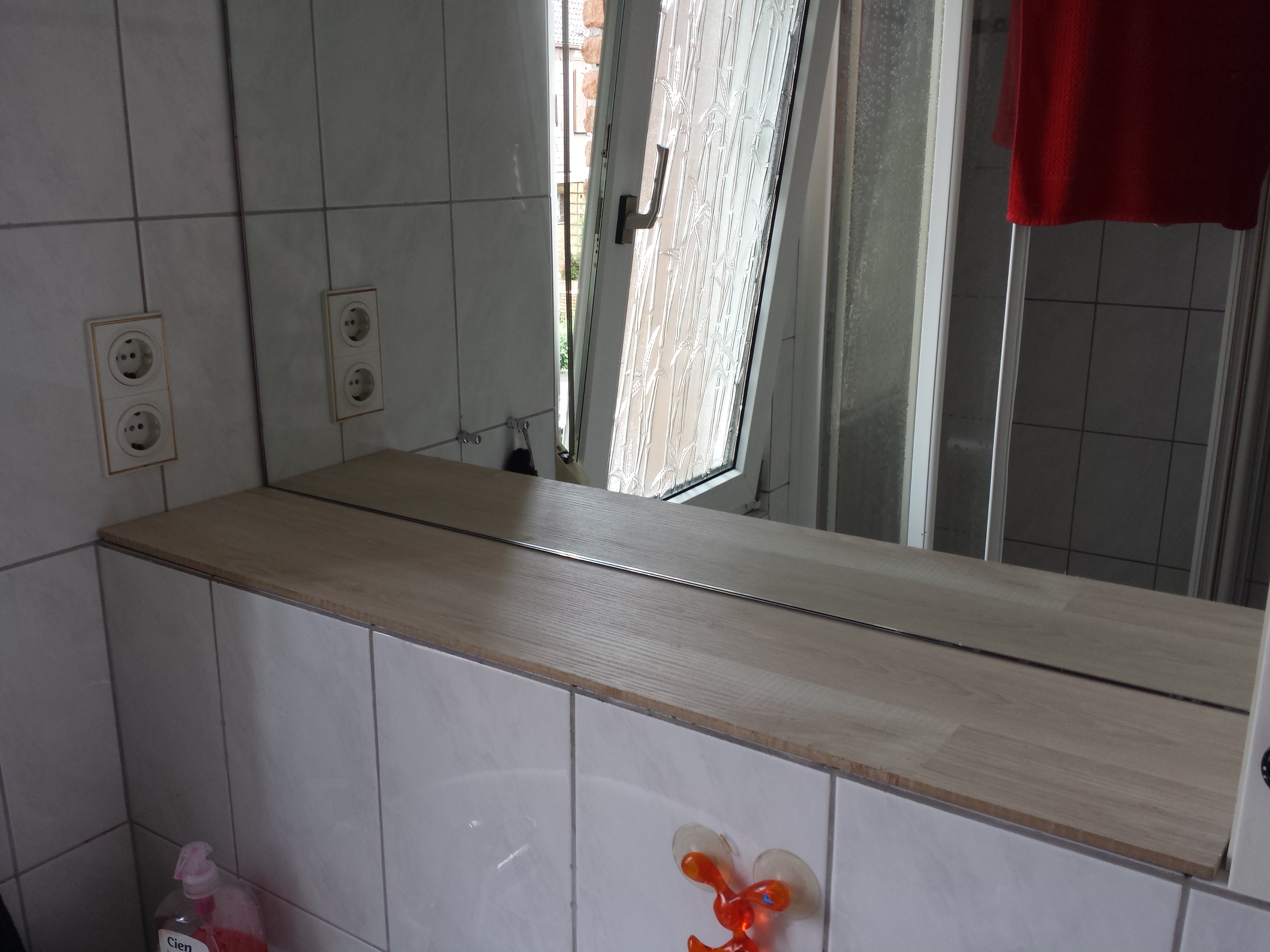 Ablage vor dem Spiegel verschönert, die Abplatzer versteckt unter einem Laminat-Brett